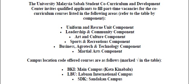 The University Malaysia Sabah Student Co-Curriculum and Development Center invites qualified applicants to fill part-time vacancies for the co-curriculum courses listed in the following areas (refer to the table by component):