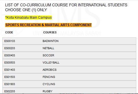 LIST OF CREDITABLE CO-CURRICULUM COURSE FOR INTERNATIONAL STUDENTS CHOOSE ONE (1) ONLY