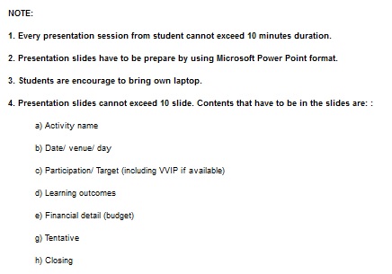 1. Setiap sesi pembentangan dari pelajar tidak boleh melebihi tempoh 10 minit.