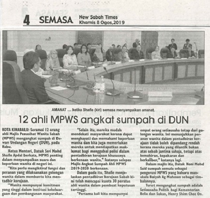Kota Kinabalu: Seramai 12 orang ahli Majlis Penasihat Wanita Sabah (MPWS) mengangkat sumpah di Dewan Undangan Negeri (DUN), pada Rabu.