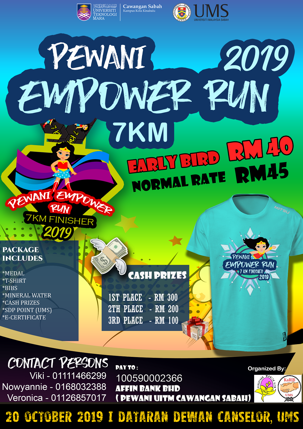 PEWANI EMPOWER RUN is co-organised by Kelab Kebajikan, Rekreasi dan Libatsama Masyarakat (KARIB), Pusat Penataran Ilmu dan Bahasa UMS with Persatuan Wanita UiTM (PEWANI). The 7km run consists of 2 categories: Men and Women.