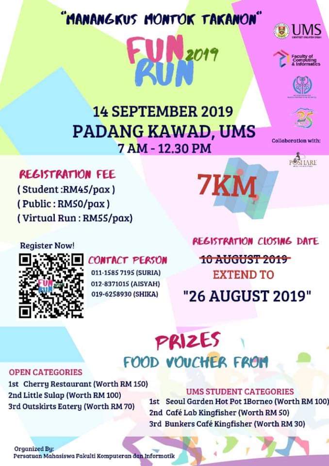 Imagine a 7KM fun run course with a Sabahan food tasting station waiting for you at every 2 kilometers of the way, just WOW! Each station is a celebration of different Sabahan tastes, featuring Sanggar Pappek, Penjaram and Tinutu Lengkuas! It is a celebration of everything about fitness, fun, great times with families/friends and Sabahan food. There's a little bit of something for everyone, so come and join us!ALL REGISTERED RUNNERS WILL RECEIVE an awesome race shirt, a finisher medal, a bib, live results online AND FREE ADMISSION to the post-race FOOD FESTIVAL (woohoo!) where you can eat more amazing food, have a drink.