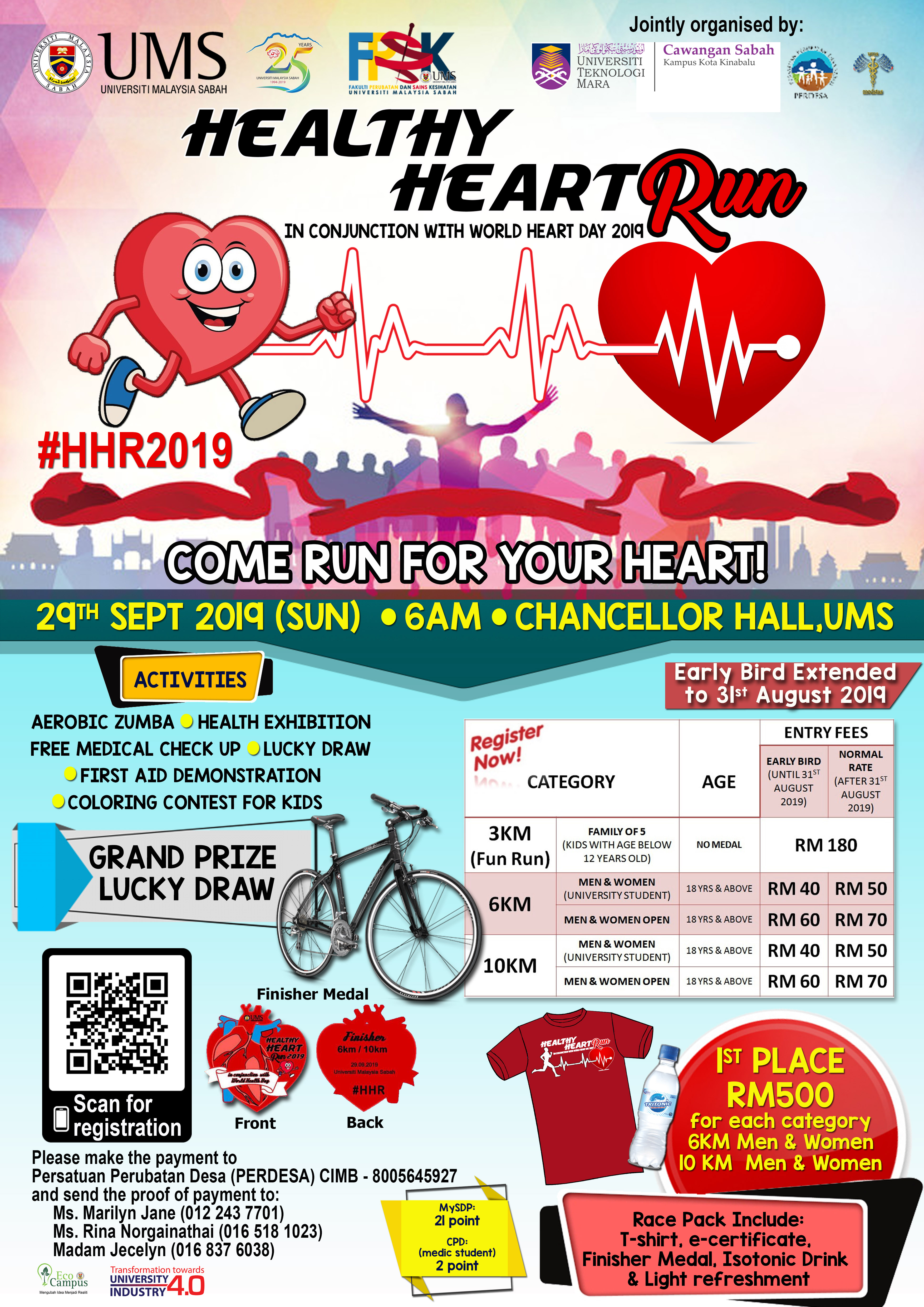 Healthy Heart Run 2019 is a 3KM (fun run), 6KM and 10KM sports event organised by Faculty of Medicine & Health Sciences, Universiti Malaysia Sabah (UMS) with Universiti Teknologi Mara (Sabah Branch), Persatuan Perubatan Desa Sabah (PERDESA) and Medical Students Association (MEDSTAS) in conjunction with the World Heart Day 2019. This event is organised to raise awareness for cardiovascular health and the importance of heart disease prevention.