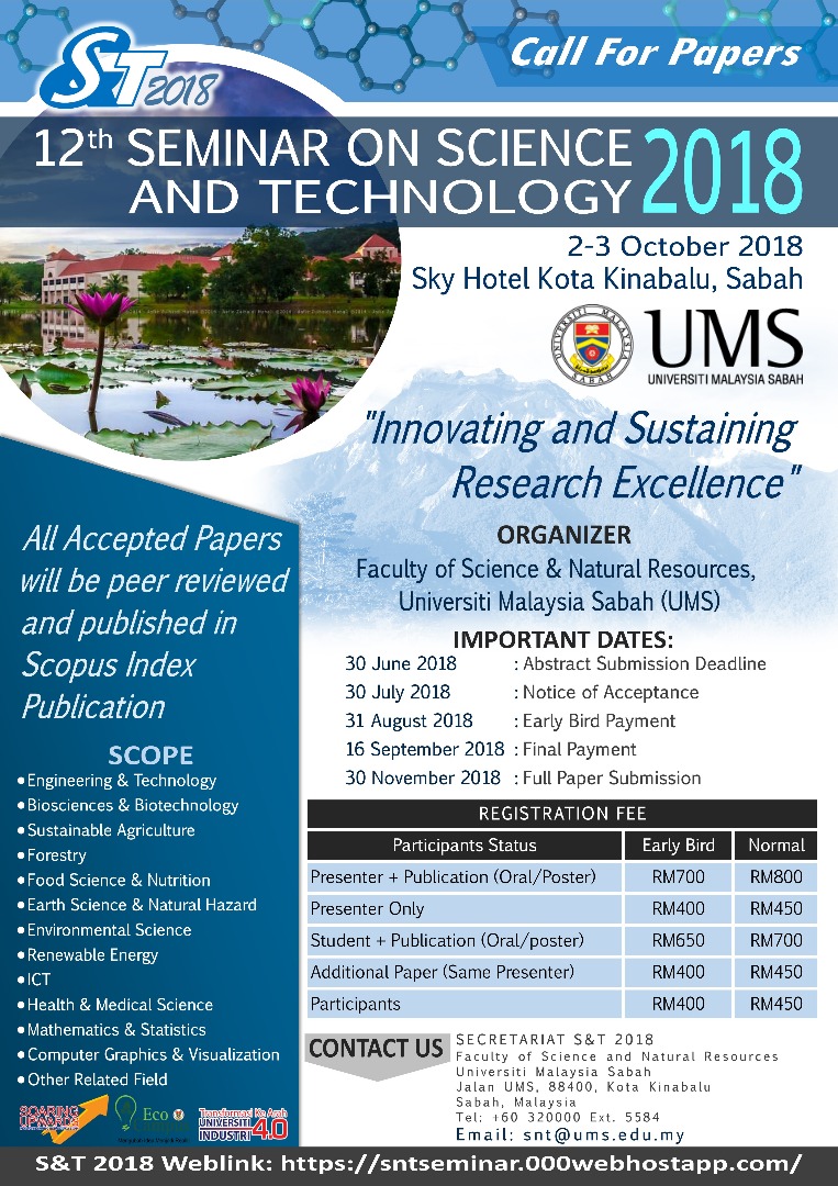 You are cordially invited to submit your manuscripts to The 12th Seminar on Science and Technology 2018 (S&T 2018) which will be held on the 2nd - 3rd October 2018 in Kota Kinabalu, Sabah, Malaysia.