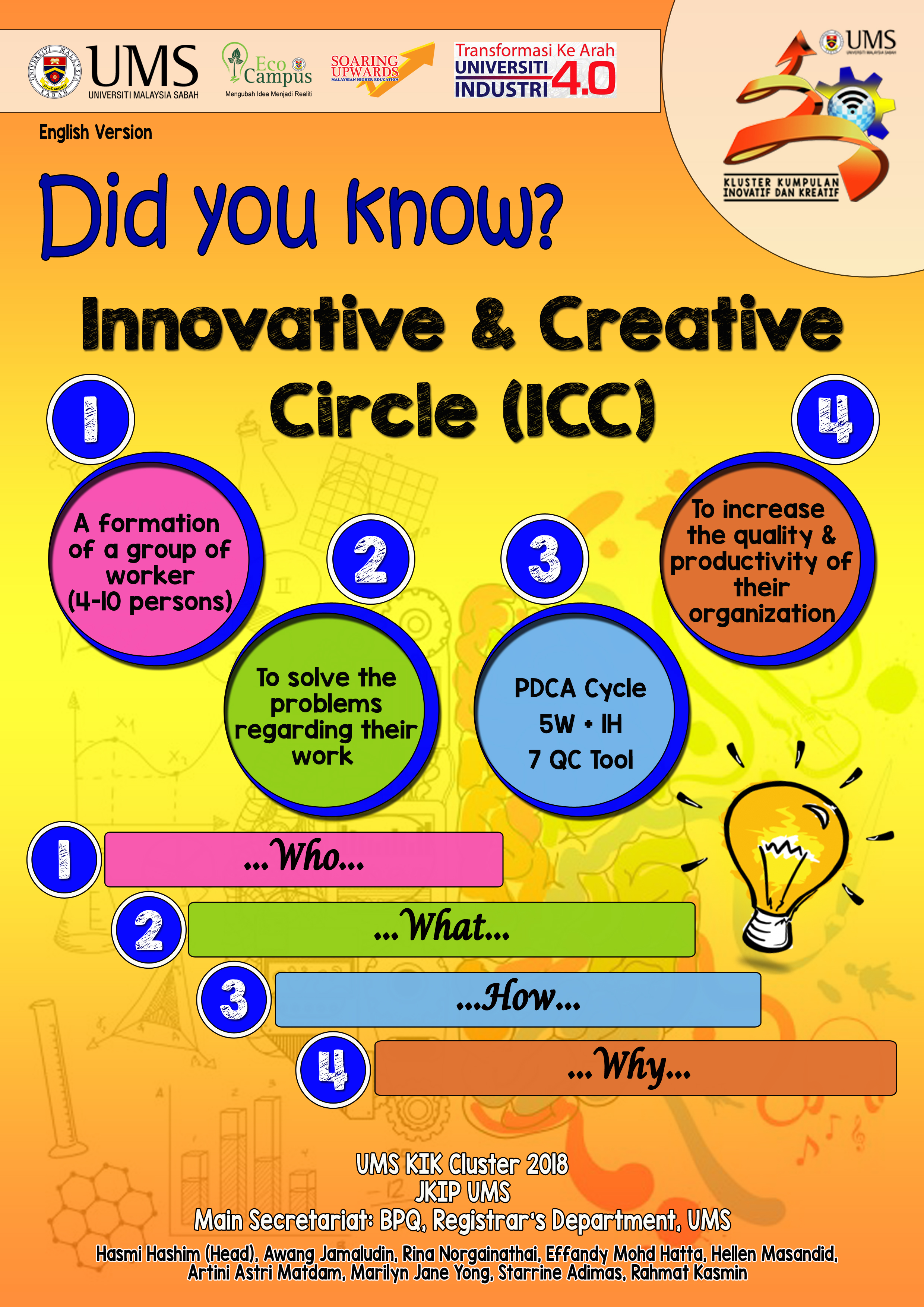 Innovative and creative group (ICC) also known as Kumpulan Inovatif dan Kreatif (KIK) is a formation of a group of worker who sit together to investigate, analyse, and find the way to solve the problems regarding their work using ICC tools and problem solving process. From the process of ICC, every single worker gets a chance to contribute ideas and opinions to their group as well as their organisation. They also will get satisfaction in daily work and other benefits such as increasing their productivity and quality of work.