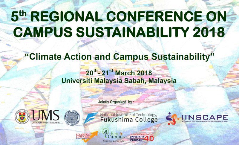 We are pleased to announce the 5th Regional Conference on Campus Sustainability (5RCCS2018) to be hosted by Universiti Malaysia Sabah (Malaysia) with the collaboration of Adamson University (Philippines)National Institute of Technology, Fukushima College (Japan) and International Institute of Human Capital and Entrepreneur Sabah (Malaysia)