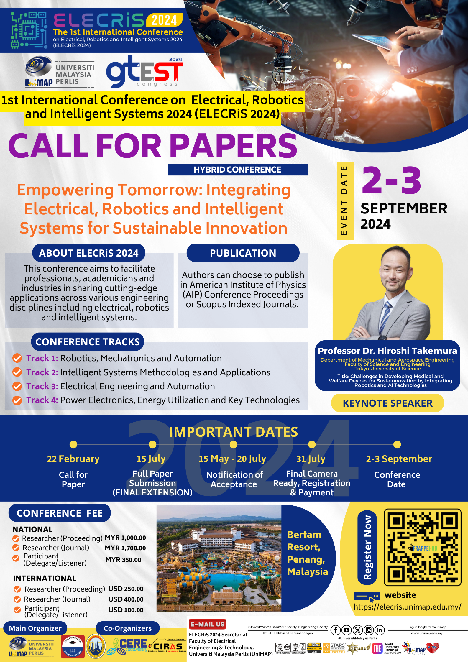 We are pleased to announce that the Faculty of Electrical Engineering & Technology, Universiti Malaysia Perlis (UniMAP), will be organising the 1st International Conference on Electrical, Robotics and Intelligent Systems 2024 (ELECRiS 2024).