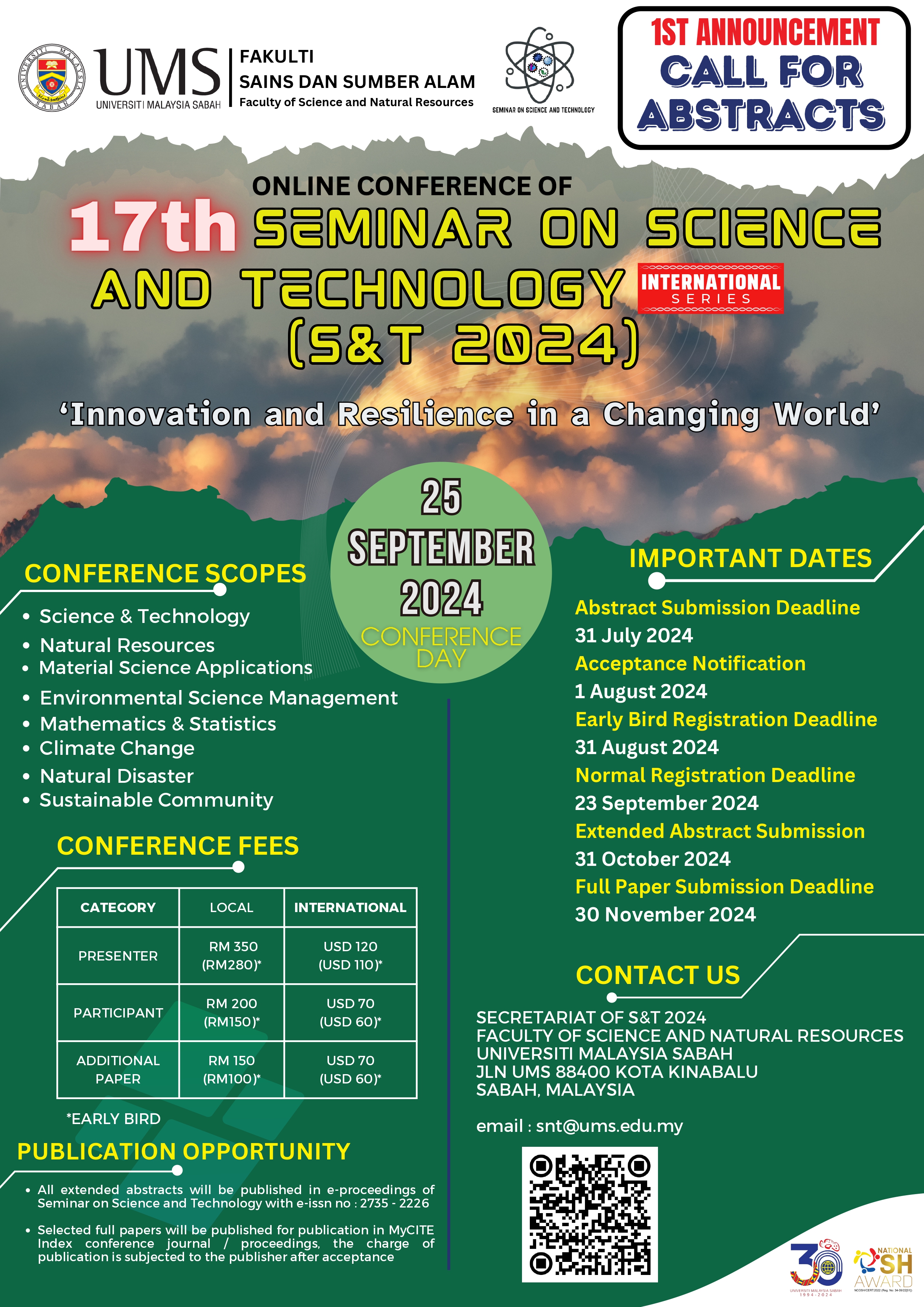 1. All extended abstracts will be published in e-proceeding of Seminar on Science and Technology with e-issn no: 2735-2226.