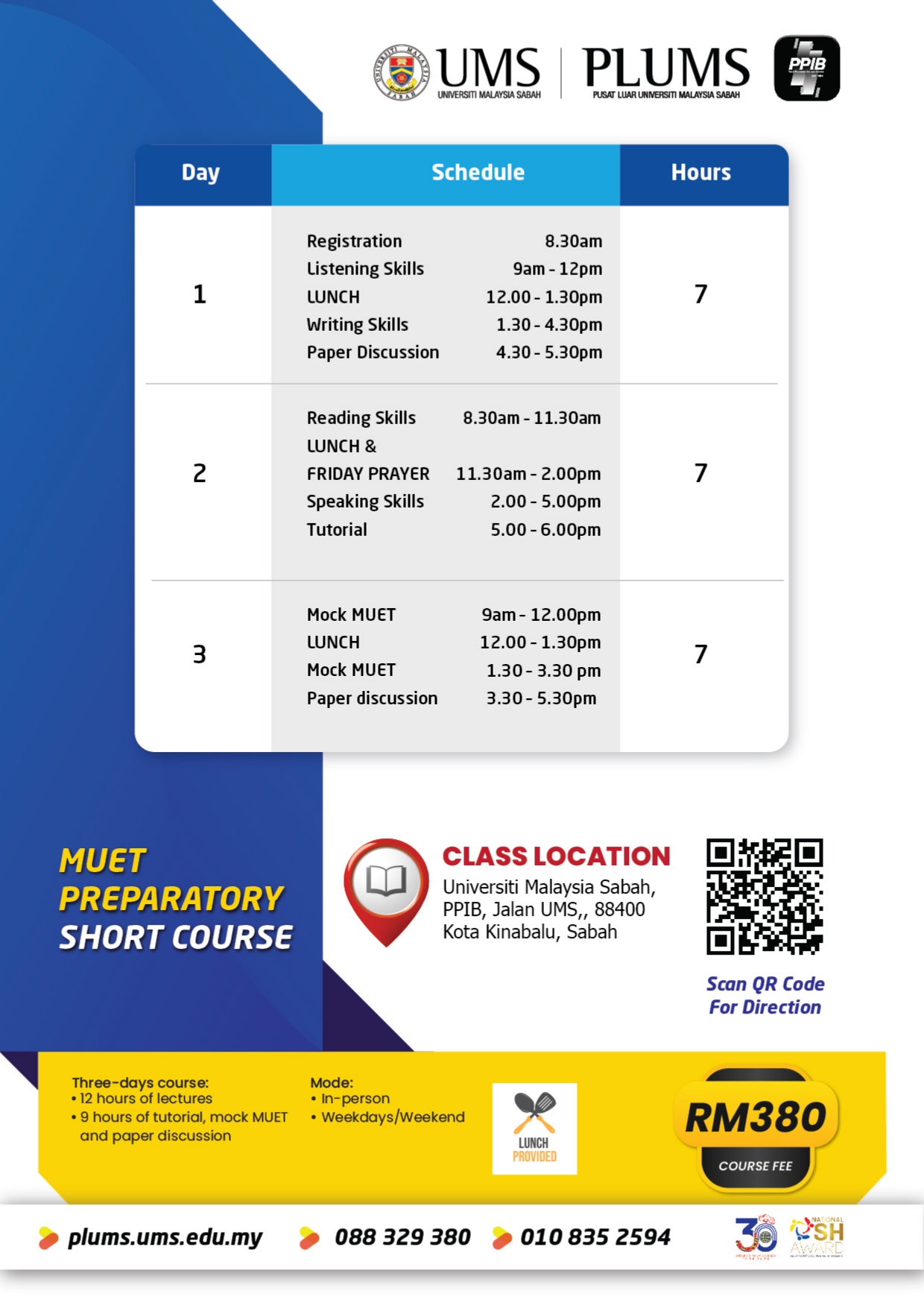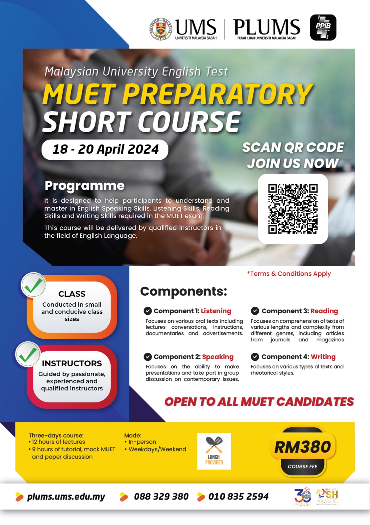 It’s designed to help participants to understand and master in English Speaking Skills, Listening Skills, Reading Skills and Writing Skills required in MUET exam.