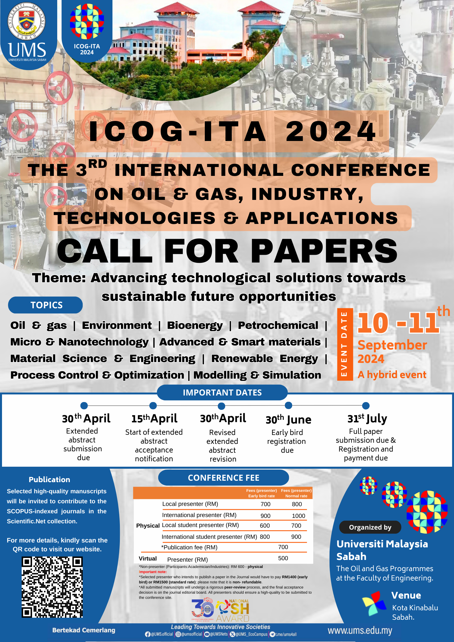 We are delighted to extend our heartfelt invitation to the 3rd International Conference on Oil & Gas Industry, Technologies & Applications 2024 (ICOG-ITA 2024), hosted by the Oil and Gas Engineering Programmes, Faculty of Engineering, Universiti Malaysia Sabah. Set to take place from September 10 to 11, 2024, ICOG-ITA 2024 promises to be an extraordinary event that blends the best of both in-person and virtual experiences.