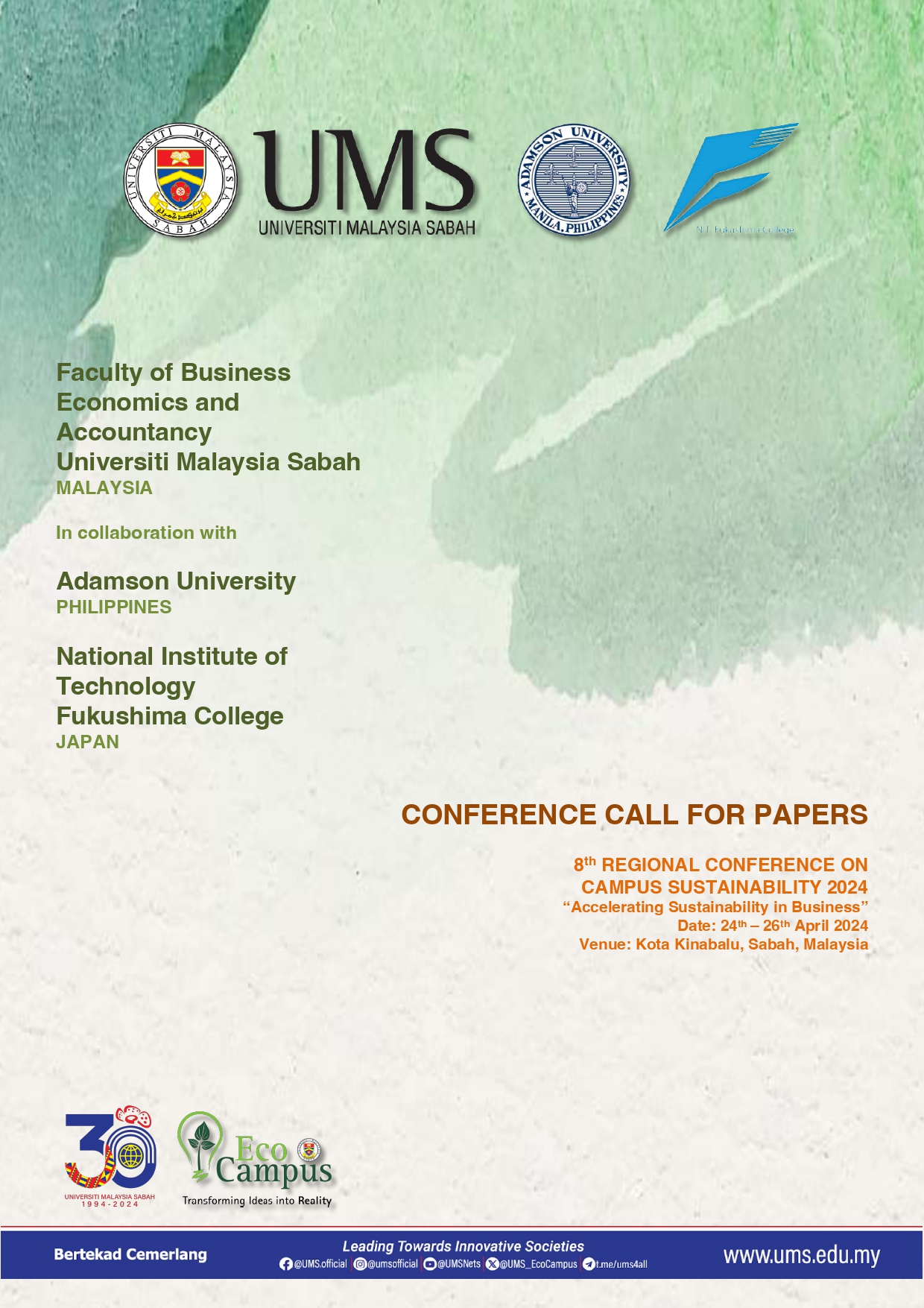 We are pleased to announce the 8th Regional Conference on Campus Sustainability 2024 (8RCCS2024) organized by Universiti Malaysia Sabah with the collaboration of Adamson University (Philippines) and National Institute of Technology, Fukushima College (Japan).