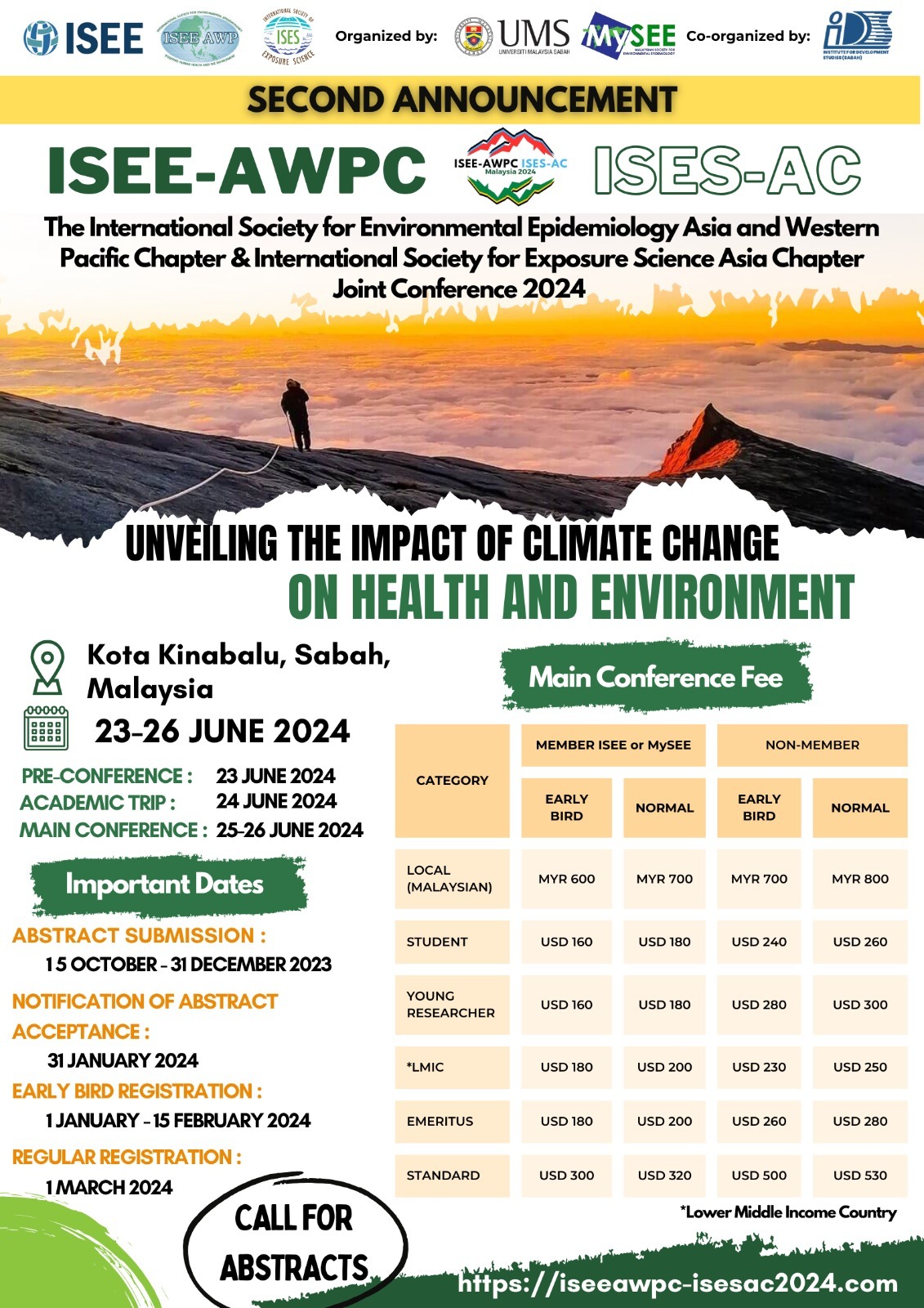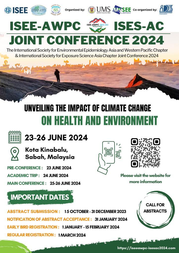 The Faculty of Medicine and Health Sciences (FMHS), Universiti Malaysia Sabah (UMS) and Malaysian Society for Environmental Epidemiology (MySEE) will be organizing the International Society for Environmental Epidemiology Asia and Western Pacific Chapter (AWPC) & International Society for Exposure Science Asia (AC) Chapter Joint Conference 2024.