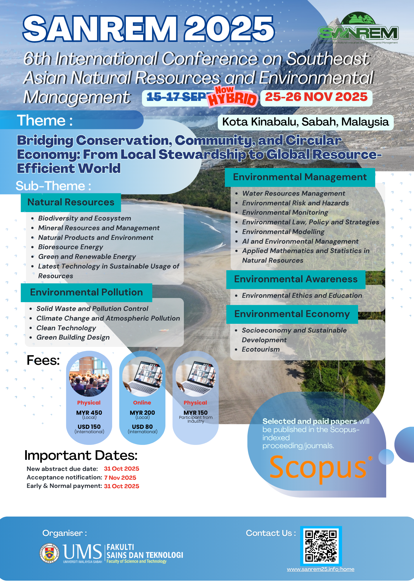 We are pleased to invite you to participate in the 6th International Conference on Southeast Asian Natural Resources and Environmental Management (SANREM 2025), organized by the Faculty of Science and Technology (FST), which will be held from 25 to 26 November 2025 in Kota Kinabalu, Sabah.