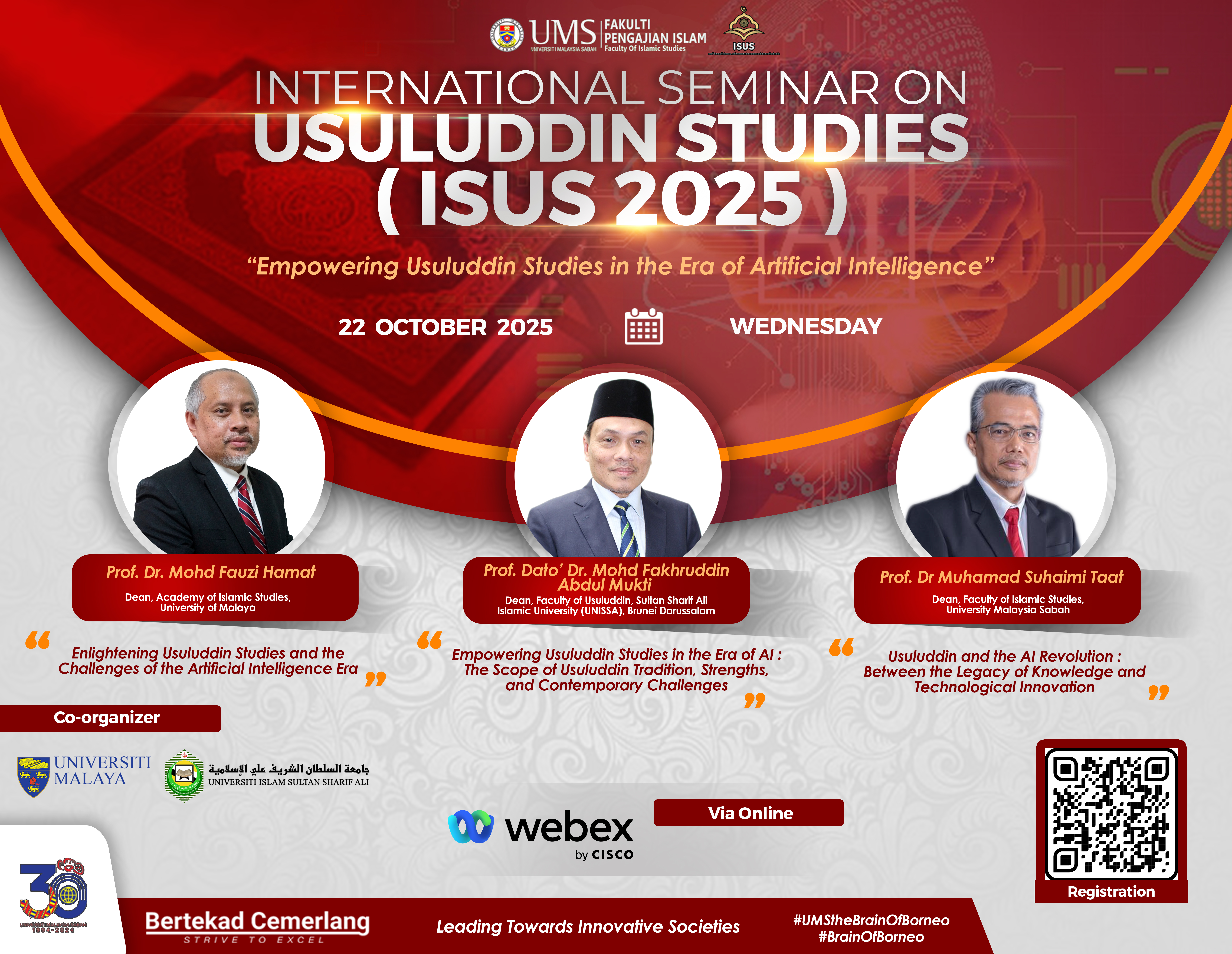 The Faculty of Islamic Studies, Universiti Malaysia Sabah (UMS) proudly presents the International Seminar on Usuluddin Studies (ISUS 2025), themed “Empowering Usuluddin Studies in the Era of Artificial Intelligence.”