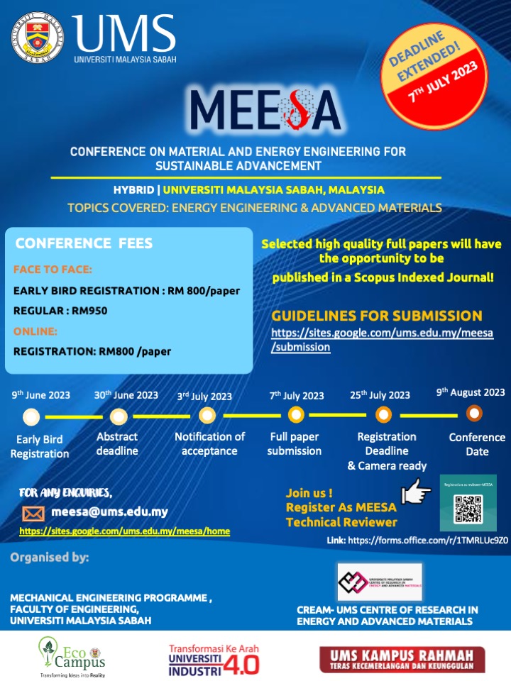 Conference of Material and Energy Engineering for Sustainable Advancement 2023 (MEESA 2023) is organized by the Mechanical Engineering Program, Faculty of Engineering UMS and UMS Centre of Research in Energy and advanced Materials (CREAM) with an aim to enculturate research and kick-start a more collaborative involvement between the researchers from all over the world for the specified fields.