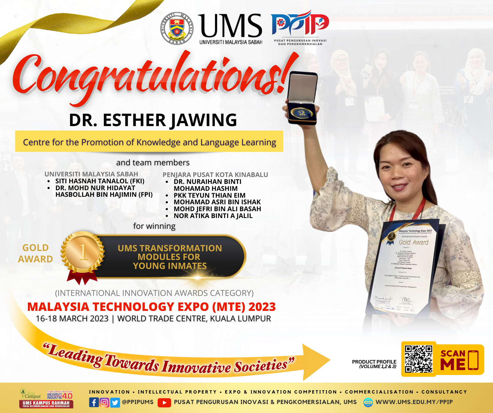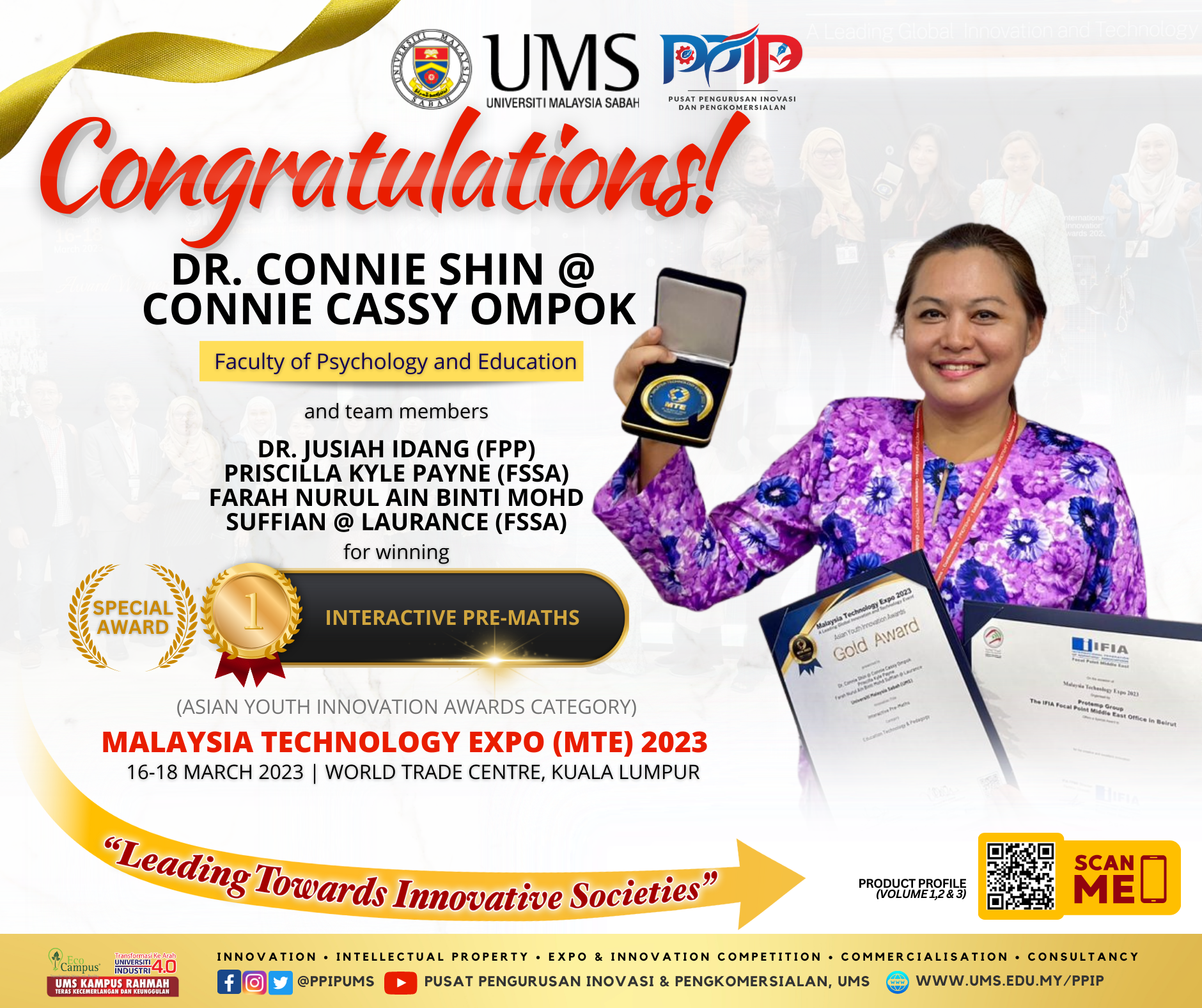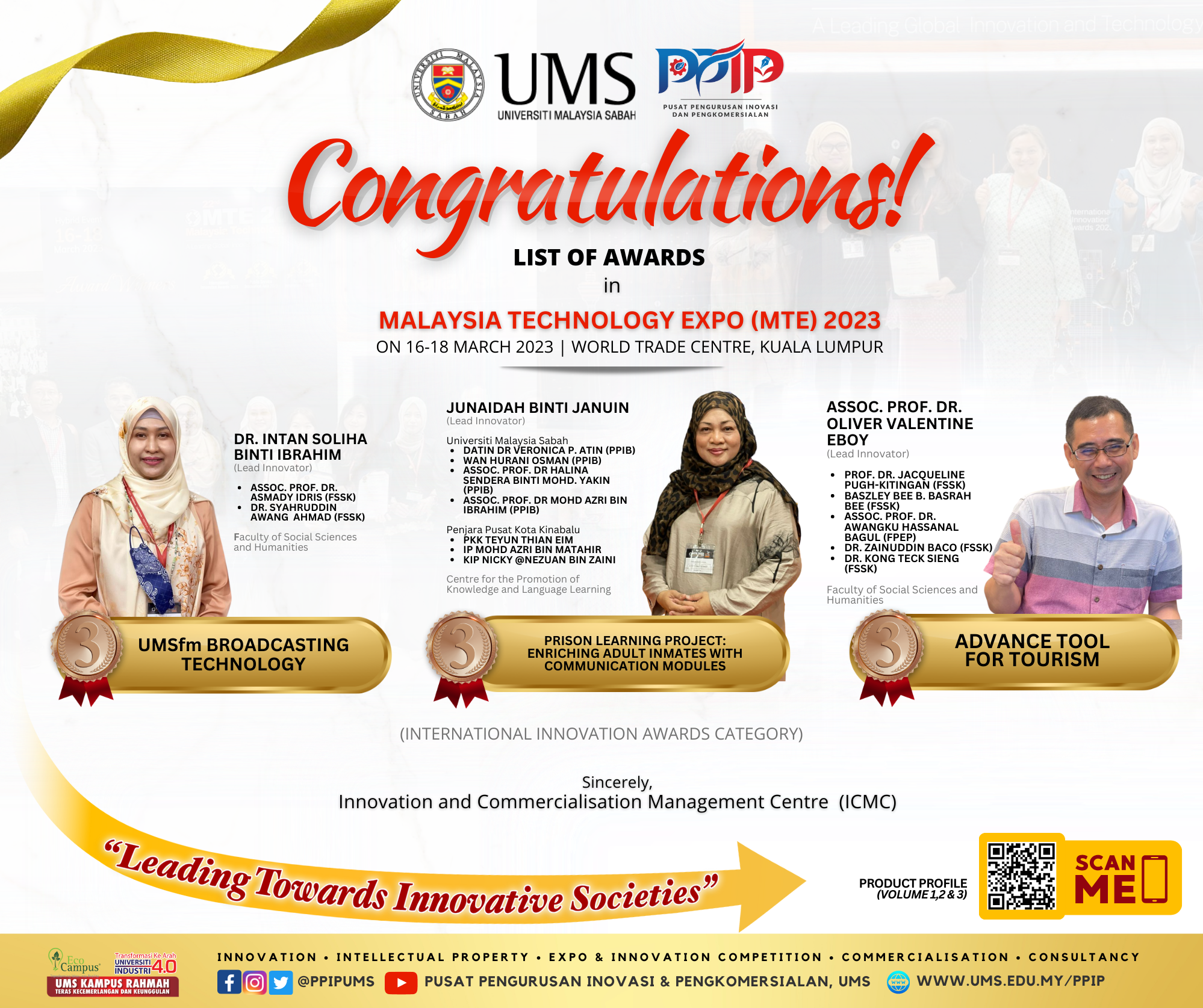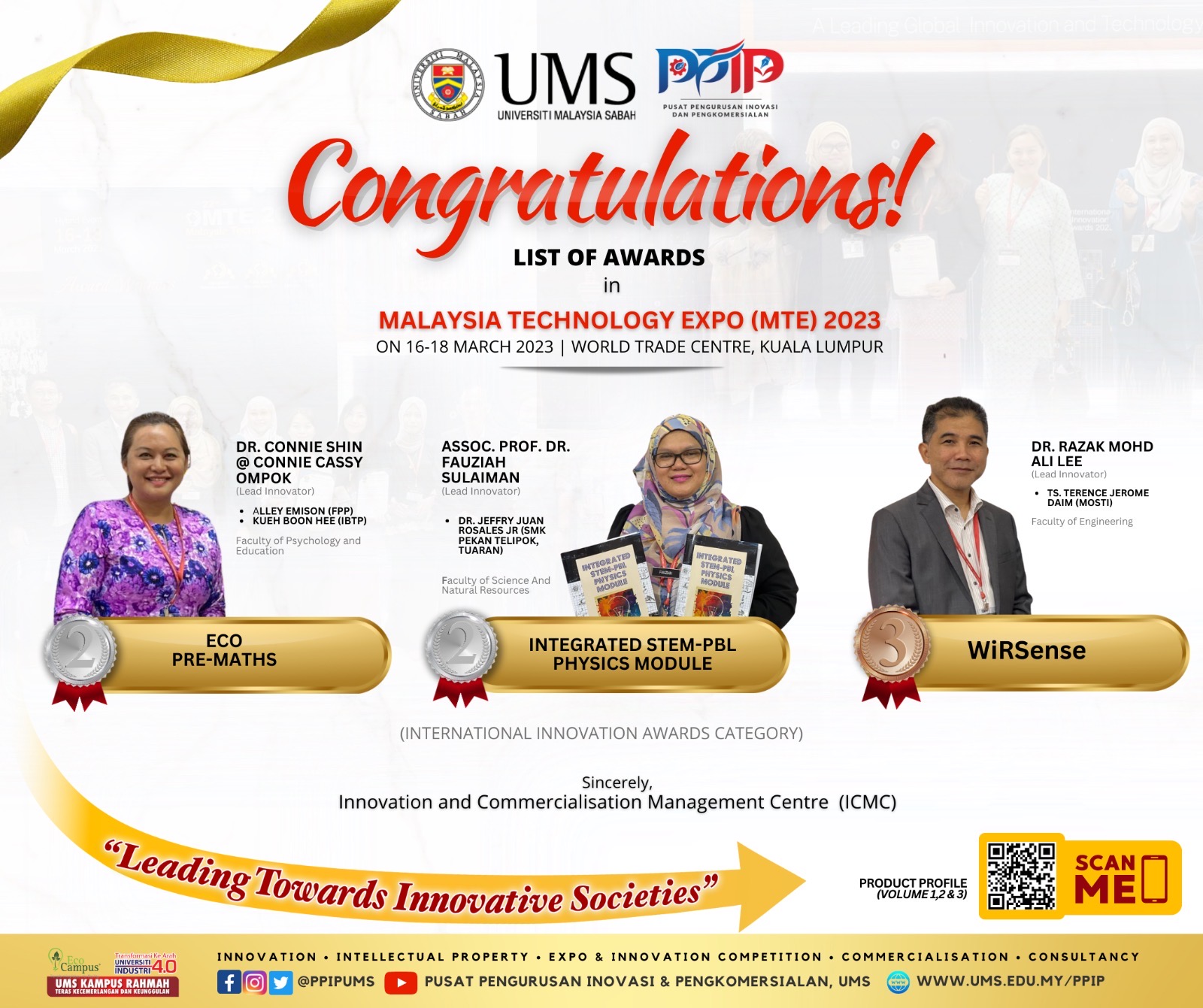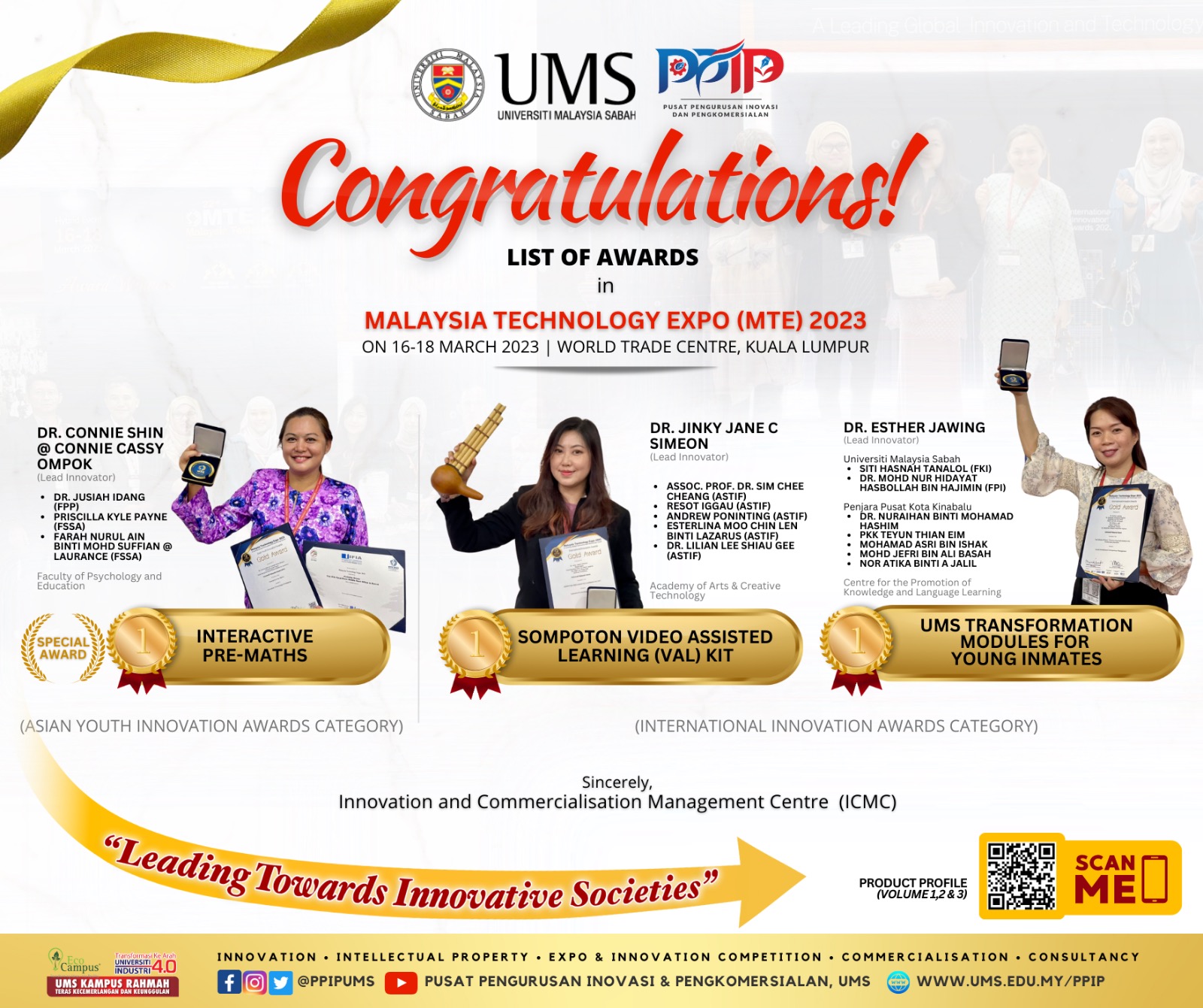 A total of 10 innovative products by Universiti Malaysia Sabah (UMS) contingent won 1 Special Award, 3 Gold Awards, 2 Silver Awards and another 4 Bronze Awards in the Malaysia Technology Expo (MTE) 2023.