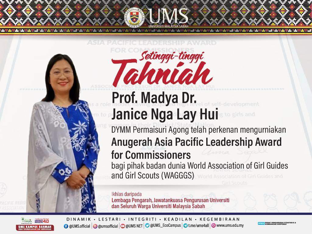 Duli Yang Maha Mulia Permaisuri Agong telah perkenan mengurniakan Anugerah Asia Pacific Leadership Award for Commisioners bagi pihak badan dunia World Association of Girl Guides and Girl Scouts (WAGGGS) kepada Prof. Madya Dr. Janice Nga Lay Hui dari Fakulti Perniagaan, Ekonomi dan Perakaunan (FPEP) UMS.