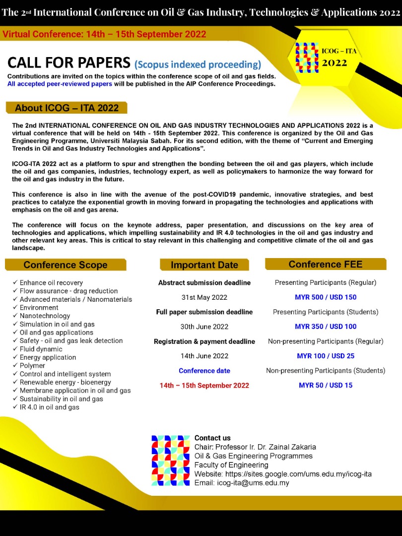 We would like to cordially invite you to submit abstracts for The 2nd International Conference on Oil & Gas Industry, Technologies & Applications (ICOG-ITA 2022), which will be held from 14th – 15th September 2022. ICOG-ITA 2022 is organized by the Oil & Gas Engineering Programme, Faculty of Engineering, Universiti Malaysia Sabah, Malaysia. The conference is going to be conducted through online mode due to the current situation of worldwide COVID-19 pandemic.