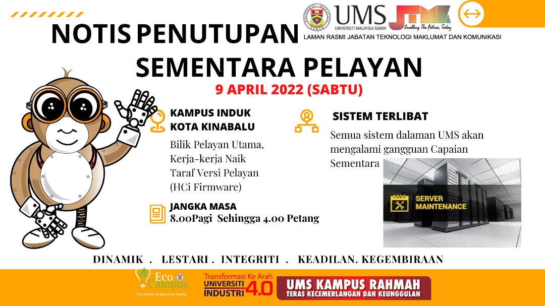 It is informed that the maintenance and upgrading of the Main Server in the Data Center Infrastructure, Department of Information and Communication Technology (JTMK), UMS will be implemented in order to provide a better service facilities.