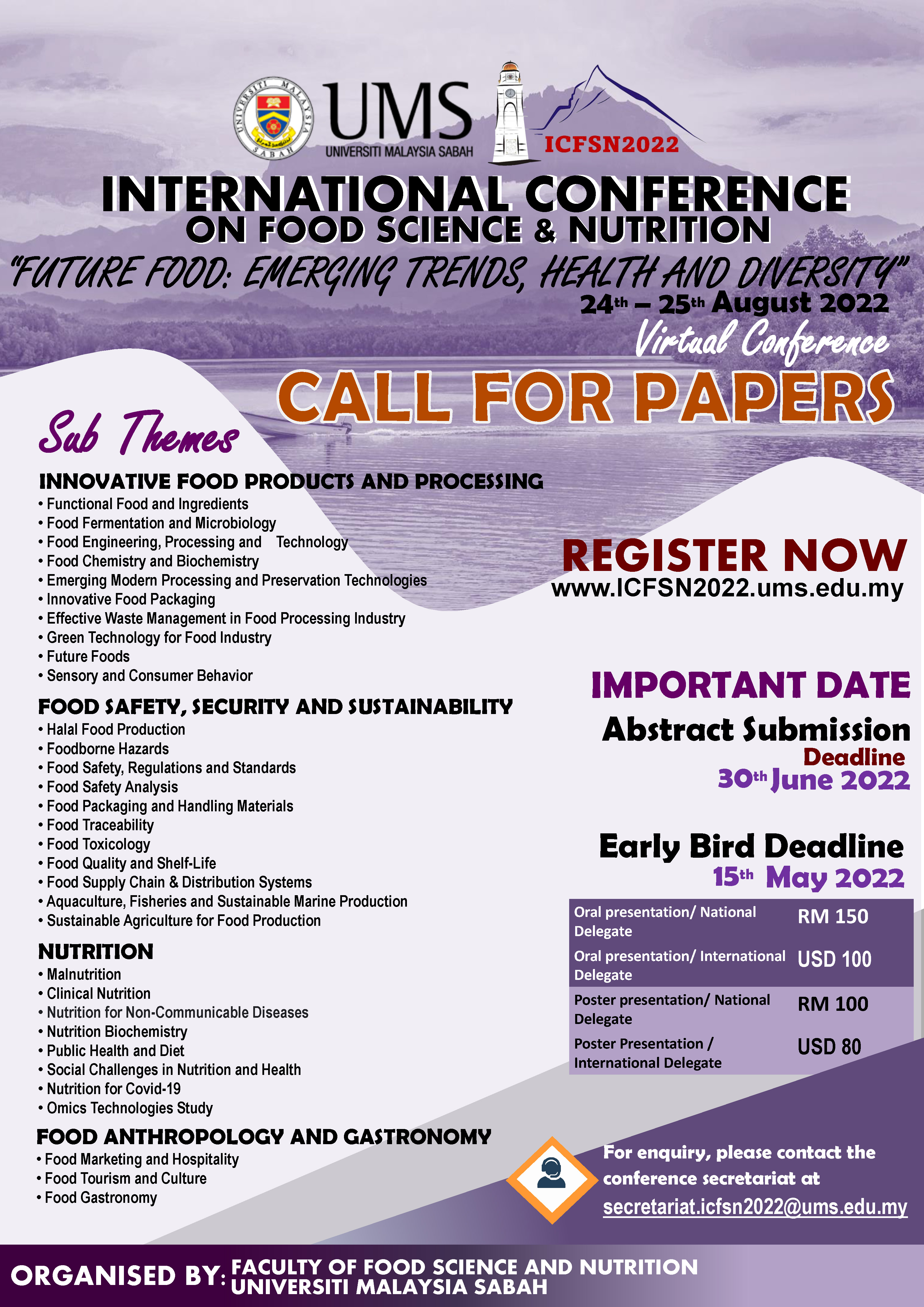 Faculty of Food Science and Nutrition, Universiti Malaysia Sabah is delighted to invite you to attend its International Conference on Food Science and Nutrition 2022 (ICFSN 2022) that will be held fully online on 24th-25th August 2022.