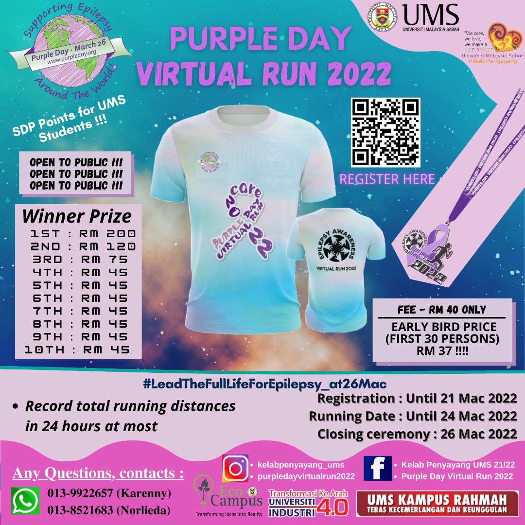 We are pleased to inform you that the UMS Caring Club (KPUMS) will hold the Purple Day Virtual Run 2022 Program in conjunction with World Epilepsy Day. Together we celebrate the World Purple Day by participating in a virtual running program organized starting on March 5, 2022.