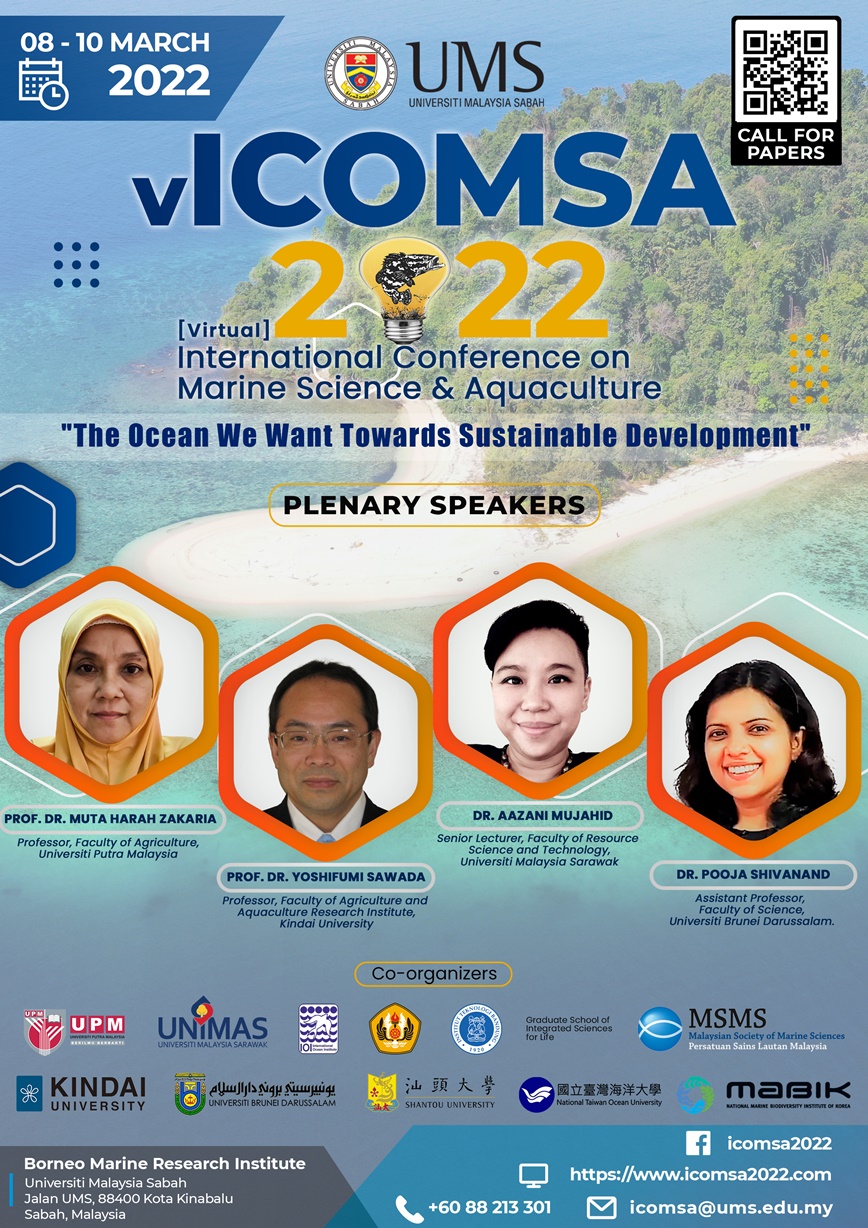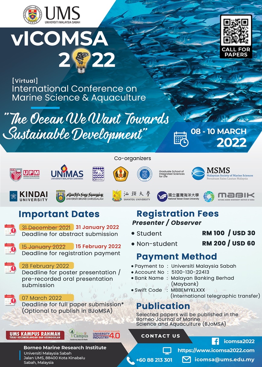 With reference to the above matter, we are pleased to invite you to the [Virtual] International Conference on Marine Science and Aquaculture (vICOMSA) 2022 which will be taking place on 8-10 March 2022.