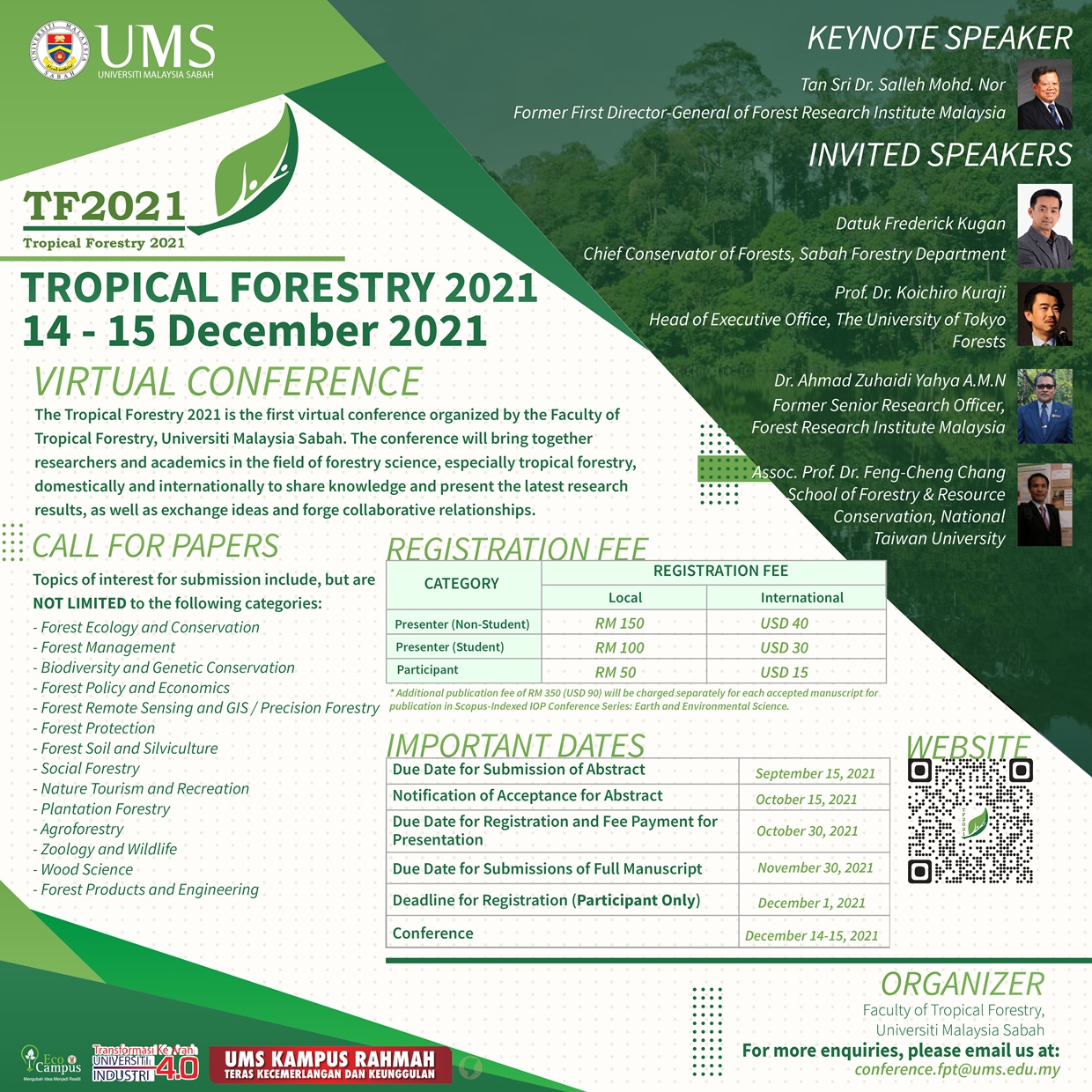 The Faculty of Tropical Forestry (FPT) Universiti Malaysia Sabah (UMS) is organizing the ‘Tropical Forestry (TF2021)’, which will be conducted in an all-virtual web-conference. The conference will bring together researchers and academics in the field of forestry science, to share knowledge and present the latest research results, as well as exchange ideas and forge collaborative relationships.