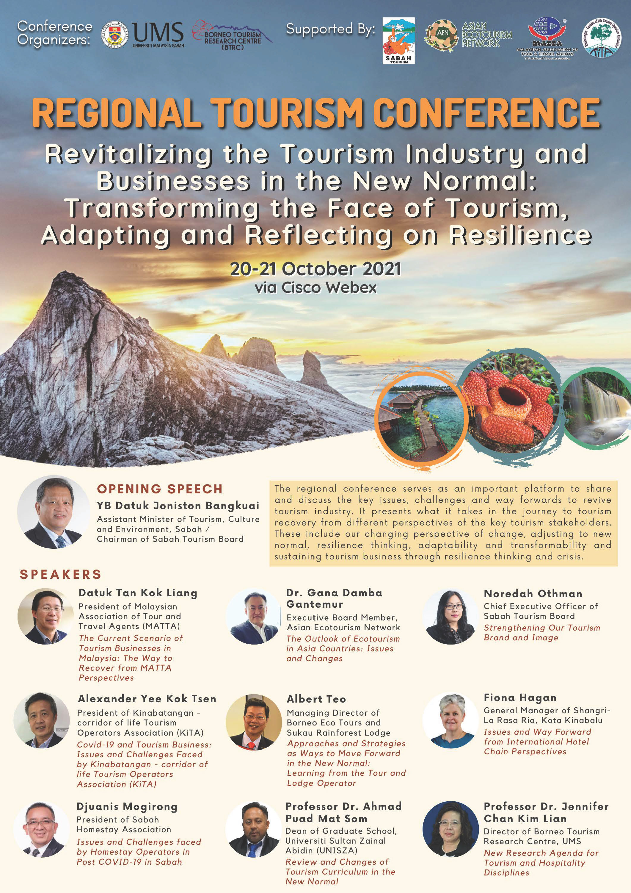 We are pleased to invite you to join us in the virtual ’Regional Tourism Conference and Workshop’ with the theme ‘Revitalizing the Tourism Industry and Businesses in the New Normal: Transforming the Face of Tourism, Adapting and Reflecting on Resilience’ on 20 - 21 October 2021. The conference is organising by Borneo Tourism Research Centre (BTRC), Universiti Malaysia Sabah supported by the Asian Ecotourism Network (AEN), Malaysian Association of Tour and Travel Agents (MATTA), Sabah Tourism Board (STB) and Kinabatangan Corridor of Life Tourism Operators Association (KiTA).