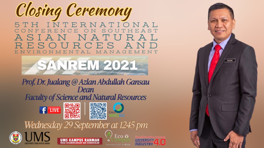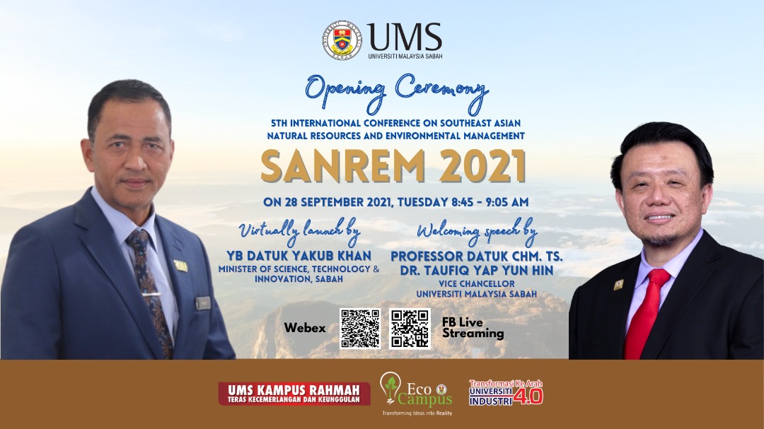 The Faculty of Science and Natural Resources (FSSA) Universiti Malaysia Sabah (UMS) is organizing the ‘5th International Conference on Southeast Asian Natural Resources and Environmental Management (SANREM 2021)’, which will be conducted from 28th to 30th September 2021 in an all-virtual, web-conference format due to COVID-19 pandemic.