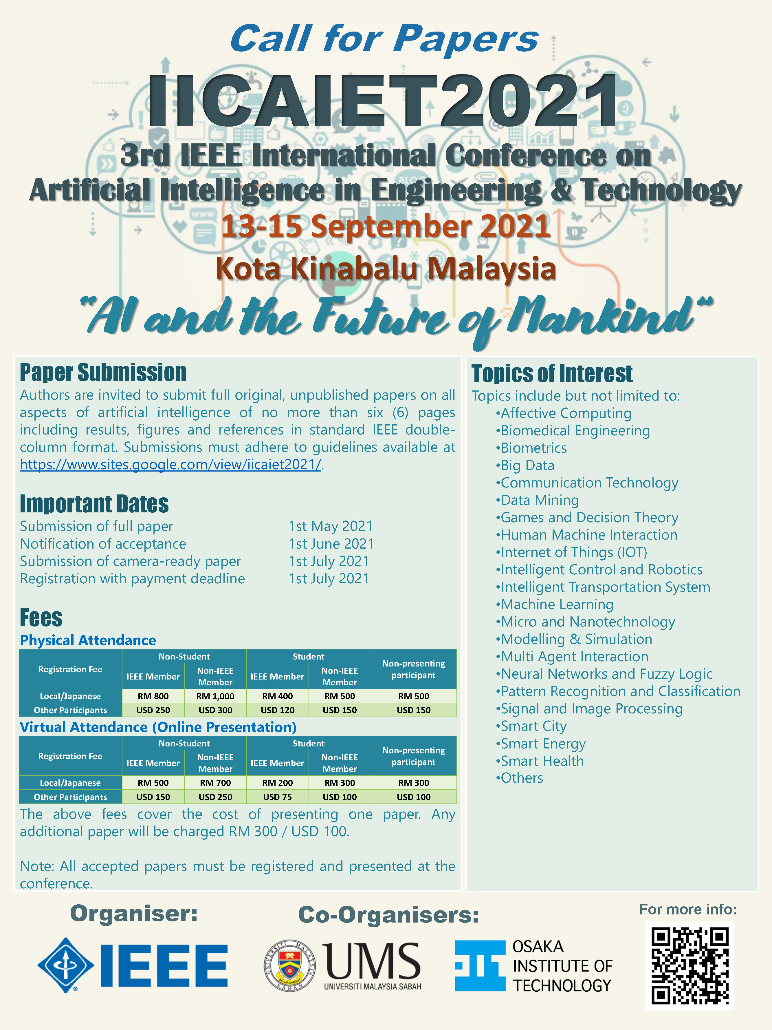 The IEEE Sabah Subsection is organizing the 3rd IEEE International Conference on Artificial Intelligence in Engineering and Technology 2021 (IICAIET2021), co-organized by the Artificial Intelligence Research Unit, Universiti Malaysia Sabah (UMS) and the Faculty of Robotics and Design, Osaka Institute of Technology (OIT), which will be held at Kota Kinabalu, Malaysia from 13 to 15 September 2021. The conference will provide an excellent platform for knowledge exchange between researchers working in the areas of Artificial Intelligence. Prospective authors are invited to submit a full paper (4-6 pages) describing original work on all aspects of artificial intelligence.