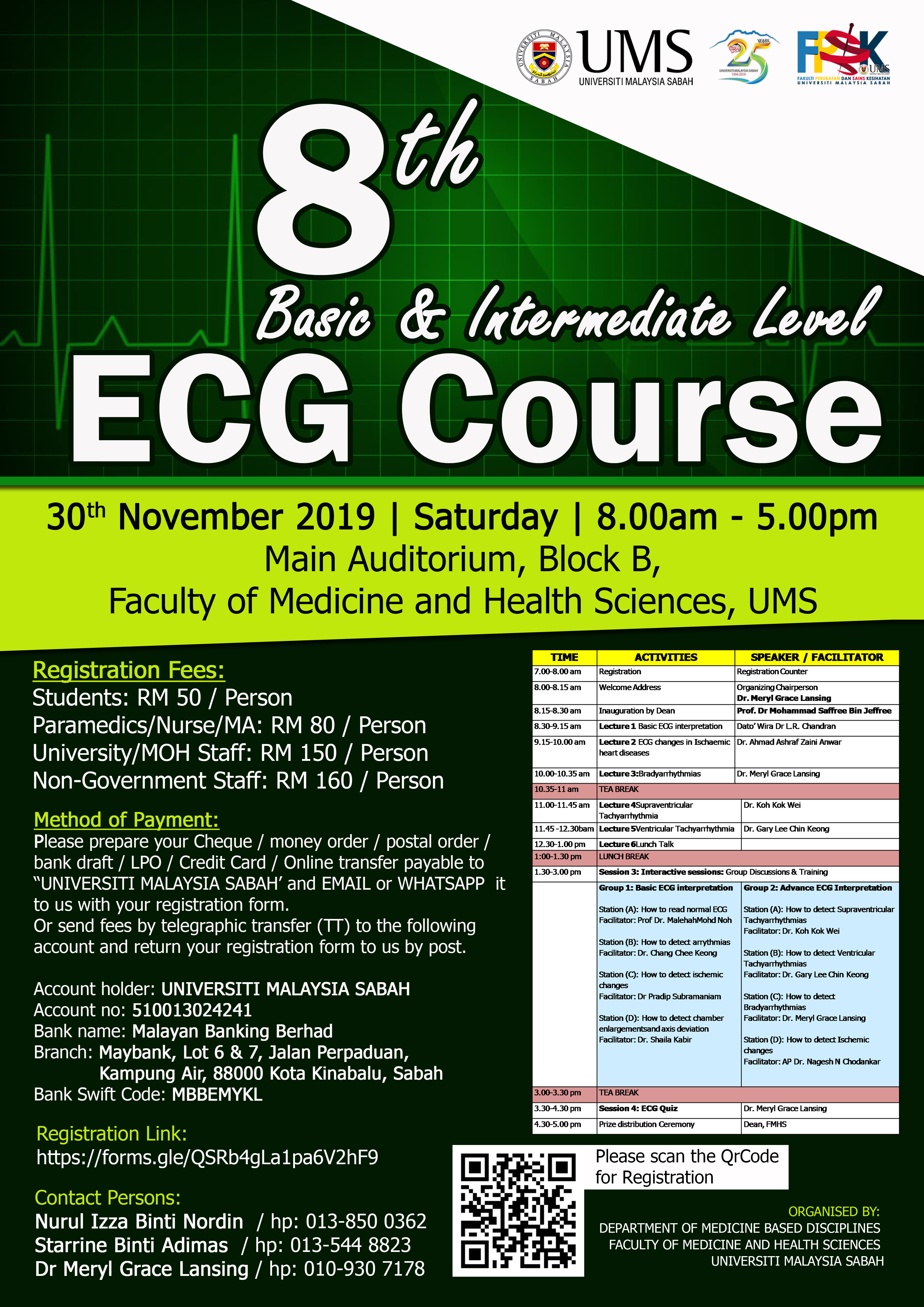 Medicine-Based Department of Faculty of Medicine and Health Sciences, UMS will be organising the "8th Basic & Intermediate ECG Course" on the 30th November 2019. The symposium will be held in Faculty of Medicine and Health Sciences, UMS. For more information, kindly refer to the attached poster. Please click this link for registration https://forms.gle/QSRb4gLa1pa6V2hF9