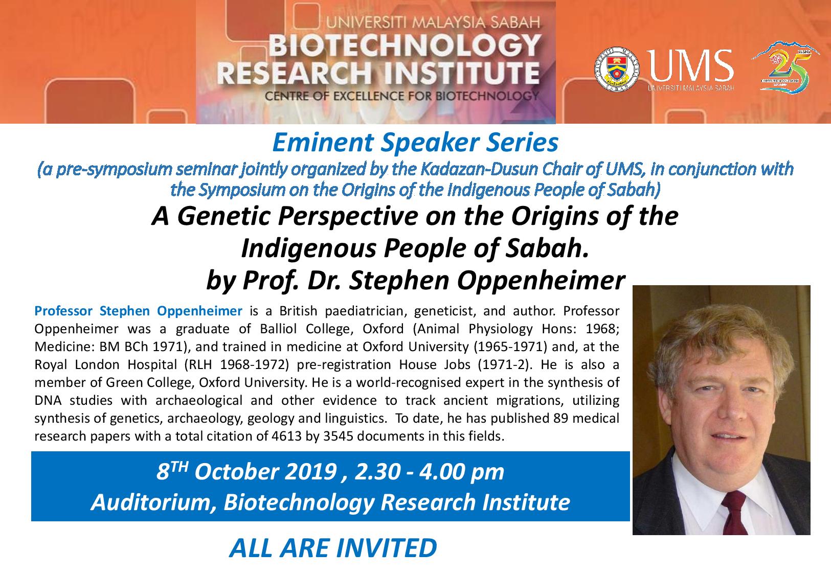 We are pleased to inform that the Biotechnology Research Institute will be organizing an Eminent Speaker Series entitled The Origins of the Indigenous People of Sabah: a Multidisciplinary Perspective presented by Professor Dr. Stephen Oppenheimer as followed