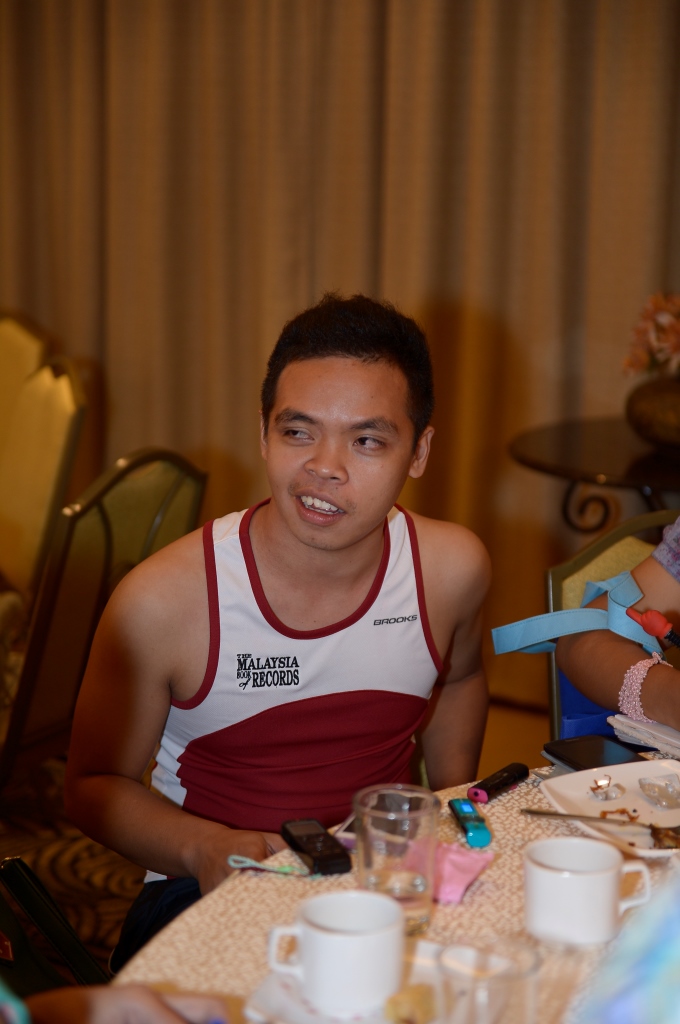 THURSDAY, 2 JANUARY 2014 – Being partially blind does not deter Universiti Malaysia Sabah (UMS) student, Abner Moilie to create a Malaysian record along with his peers for the Malaysia Book of Record: Longest Distance Running On a treadmill By a Group 2014, a record which is presently held by UiTM Samarahan branch.The Second Year Bachelor of Sports Science student who hails from Tamparuli, Sabah is determined to finish the run on treadmill for 2 hours on rotation with his peers for 11 days. Abner also has the support of his family and has been doing periodic training in preparation for the challenge.