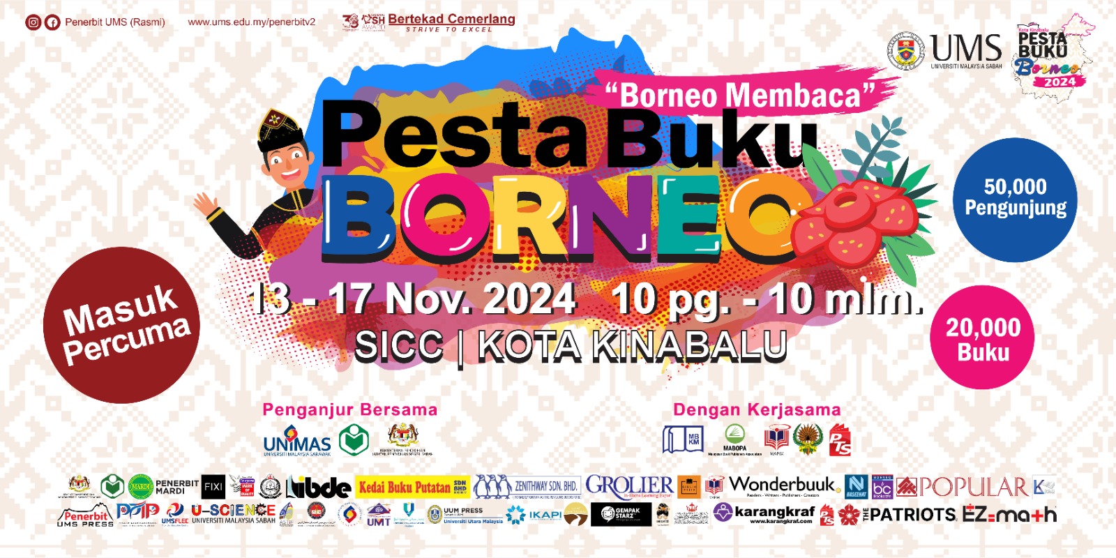 The Borneo Book Festival 2024 (PBB 2024) will be held from November 13 to 17 at Kinabatangan Hall III, Sabah International Convention Centre, from 10:00 AM to 10:00 PM.