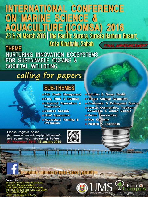 MONDAY, 21 MARCH – The Borneo Marine Research Institute (IPMB), Universiti Malaysia Sabah (UMS) will be organising the International Conference on Marine Science and Aquaculture (ICOMSA 2016) on 23 and 24 March in Kota Kinabalu.