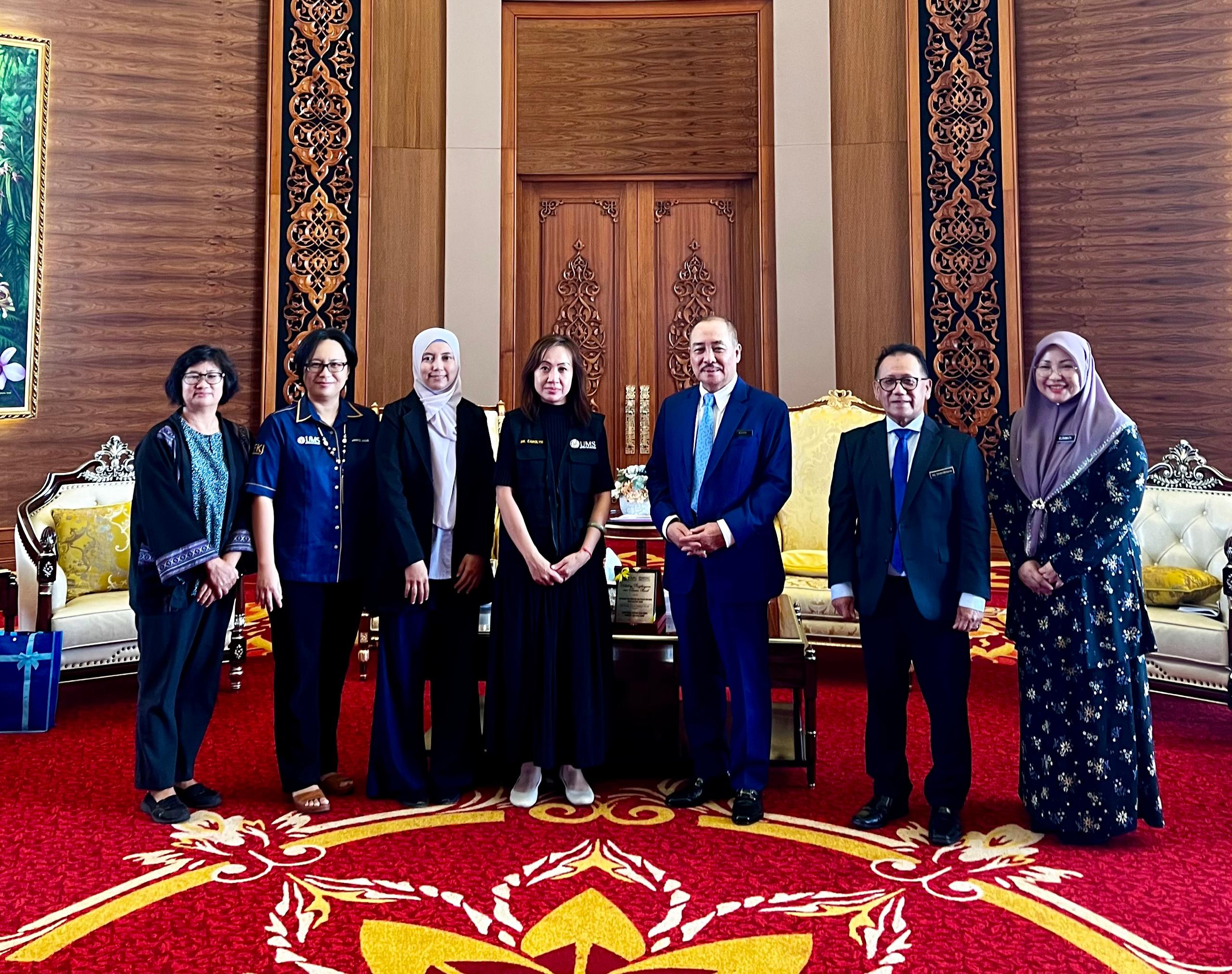 Among the NDRC UMS delegates present during the courtesy visit were the Head of the Coastal and River Erosion Cluster, Associate Professor Ts. Dr. Ejria Saleh; the Head of the Earthquake Cluster, Ir. Ts. Dr. Noor Sheena Herayani Harith; the Head of the Flood Cluster, Dr. Janice Lynn Ayog; and NDRC Research Officer, Eldawaty Madran.