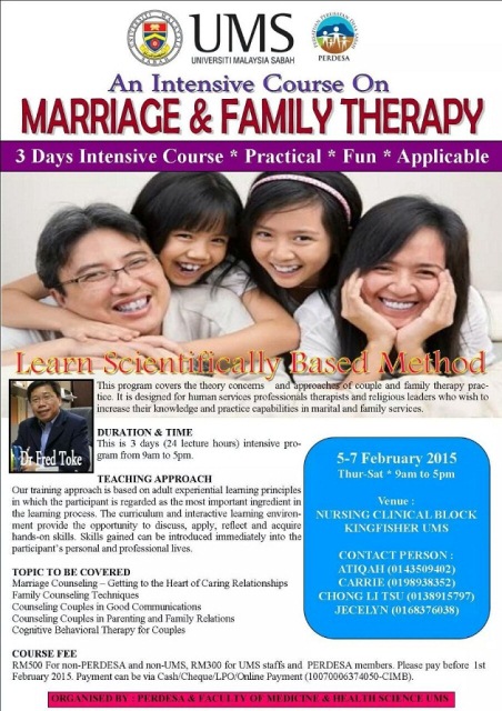 marriage  familyWEDNESDAY, 14 JANUARY – Universiti Malaysia Sabah (UMS) through the Faculty of Medicine and Health Sciences (FKSK) will be organising an intensive course on Marriage and Family Therapy from 5-7 February 2015, between 9.00 am until 5.00 pm.