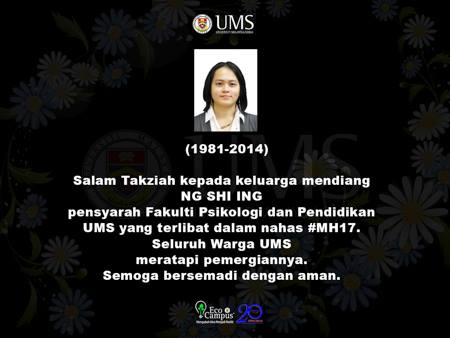 In addition, the Faculty of Psychology and Education (FPP) UMS will be organising a Mourning and Final Tribute to its lecturer, the late Ng Shi Ing who was involved in the MH17 fatality, at the Mini Auditorium, Education block of the faculty.