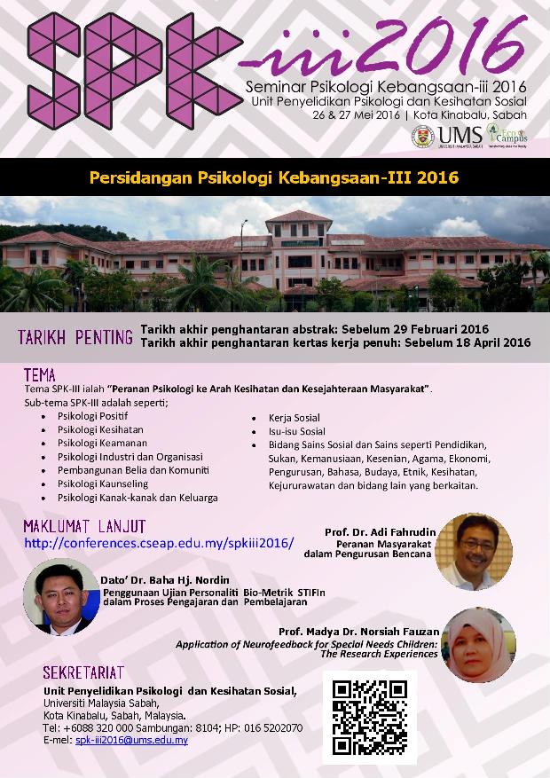 ![]() | PengenalanLatar BelakangSeminar Psikologi Kebangsaan-III 2016 (SPK-III 2016) merupakan seminar kali ketiga dianjurkan oleh Unit Penyelidikan Psikologi dan Kesihatan Sosial (UPPsiKS). Seminar ini diadakan bertujuan sebagai platform kepada penyelidik, ahli akademik, kakitangan kerajaan, bukan kerajaan termasuk pelajar dalam bidang psikologi khususnya untuk berkongsi dapatan kajian masing-masing di peringkat kebangsaan. Seminar ini akan diadakan di Fakulti Psikologi dan Pendidikan (FPP), Universiti Malaysia Sabah (UMS) pada 26 & 27 Mei 2016. Dijangkakan seramai 200 orang peserta daripada Institusi Pengajian Tinggi Awam (IPTA), Institusi Pengajian Tinggi Swasta (IPTS), badan kerajaan dan badan bukan kerajaan di seluruh negara akan menyertai seminar ini. Jawatankuasa penganjur seminar ini adalah terdiri daripada kakitangan UPPsiKS dan kakitangan FPP, UMS. Memandangkan bidang psikologi merupakan bidang yang sentiasa berkembang dari semasa ke semasa, banyak kajian berkaitan pelbagai bidang dalam psikologi telah dijalankan di Malaysia. Oleh yang demikian, pihak UPPsiKS merasakan adalah satu usaha yang baik sekiranya dapatan kajian oleh penyelidik di seluruh negara dapat dikongsi bersama sebagai perkongsian ilmu dan membuka ruang untuk jalinan kerjasama dalam penyelidikan, penerbitan dan perundingan. Adalah diharapkan peranan dan fungsi bidang psikologi di Malaysia dapat dimanfaatkan dan diperluaskan sesama penyelidik tempatan dan negara serantau melalui penganjuran seminar ini. Tema SeminarTema Seminar SPK-III 2016 "Peranan Psikologi ke Arah Kesihatan dan Kesejahteraan Masyarakat" Seminar ini diadakan sebagai platform kepada penyelidik, ahli akademik, pelajar dalam bidang psikologi khususnya untuk berkongsi dapatan kajian masing-masing di peringkat kebangsaan. |