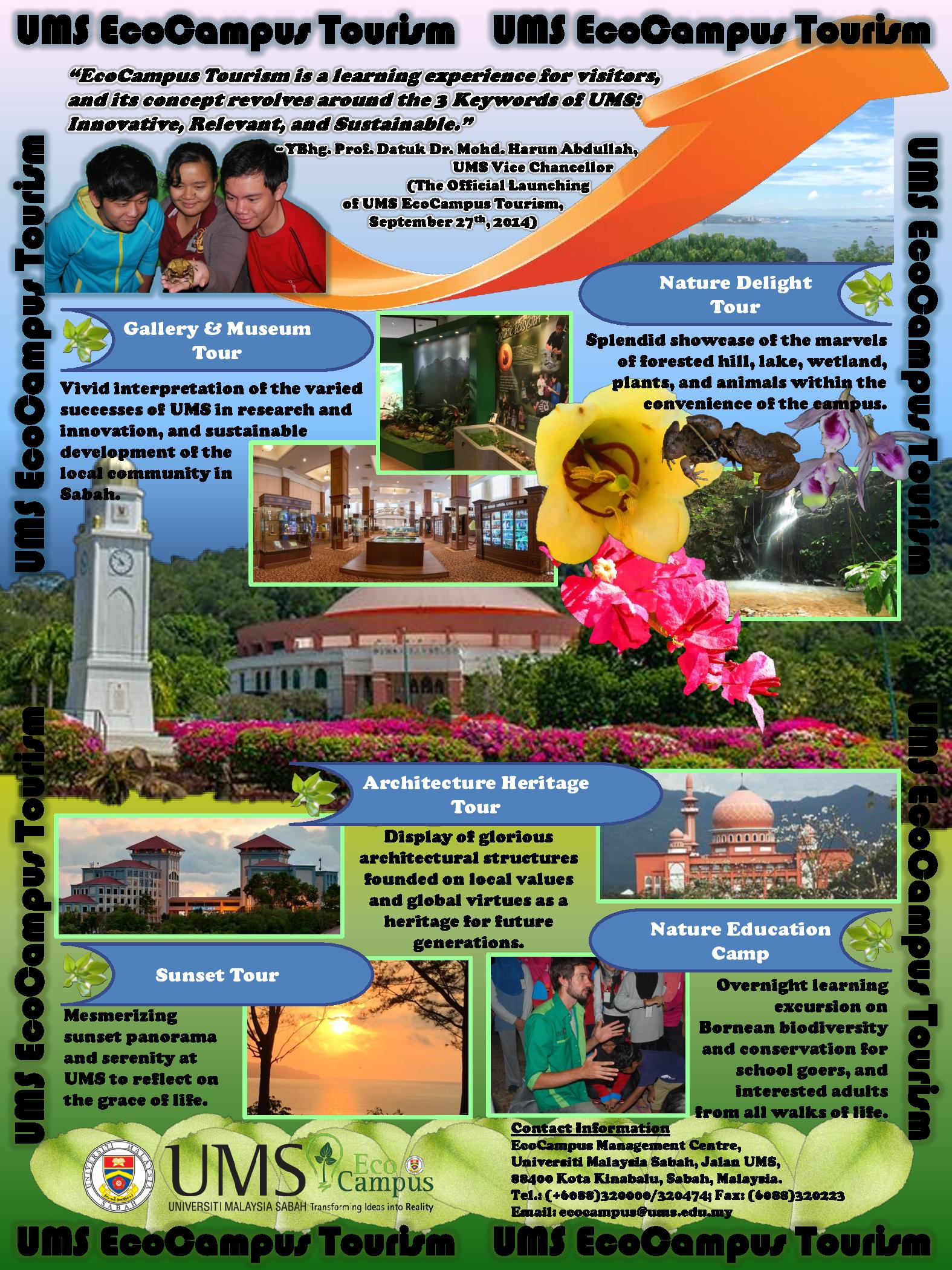 "EcoCampus Tourism is a learning experience for visitors, and its concept revolves around the 3 Keywords of UMS: Innovative, Relevant, and Sustainable."There are five EcoCampus Tourism Packages founded on the concepts of Nature Tourism and Green Tourism are available. Nature Tourism is defined as ‘responsible travel to natural areas or related venues with the objectives of seeing, admiring, enjoying and learning about the environment and its flora and fauna, as well as any local culture (past and present) found in the areas without causing perilous disturbances and destruction, for environmental conservation and the well-being of local people’. Green Tourism is defined as ‘responsible travel to natural areas or related venues with minimal climate impacts through efficient and sustainable utilization of energy and water, minimized production of wastes, recycling, and promotion of environmentally friendly products for the conservation of natural resources, reduction of operating cost, and enhancement of tourist satisfaction’.