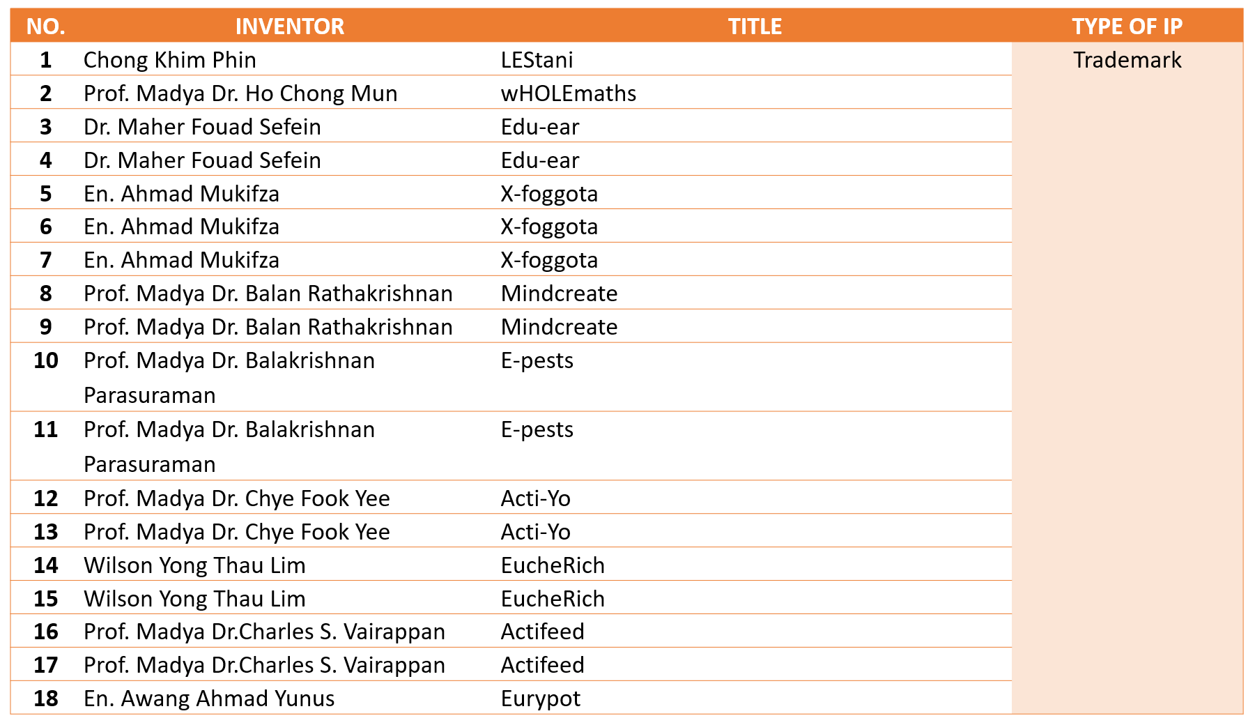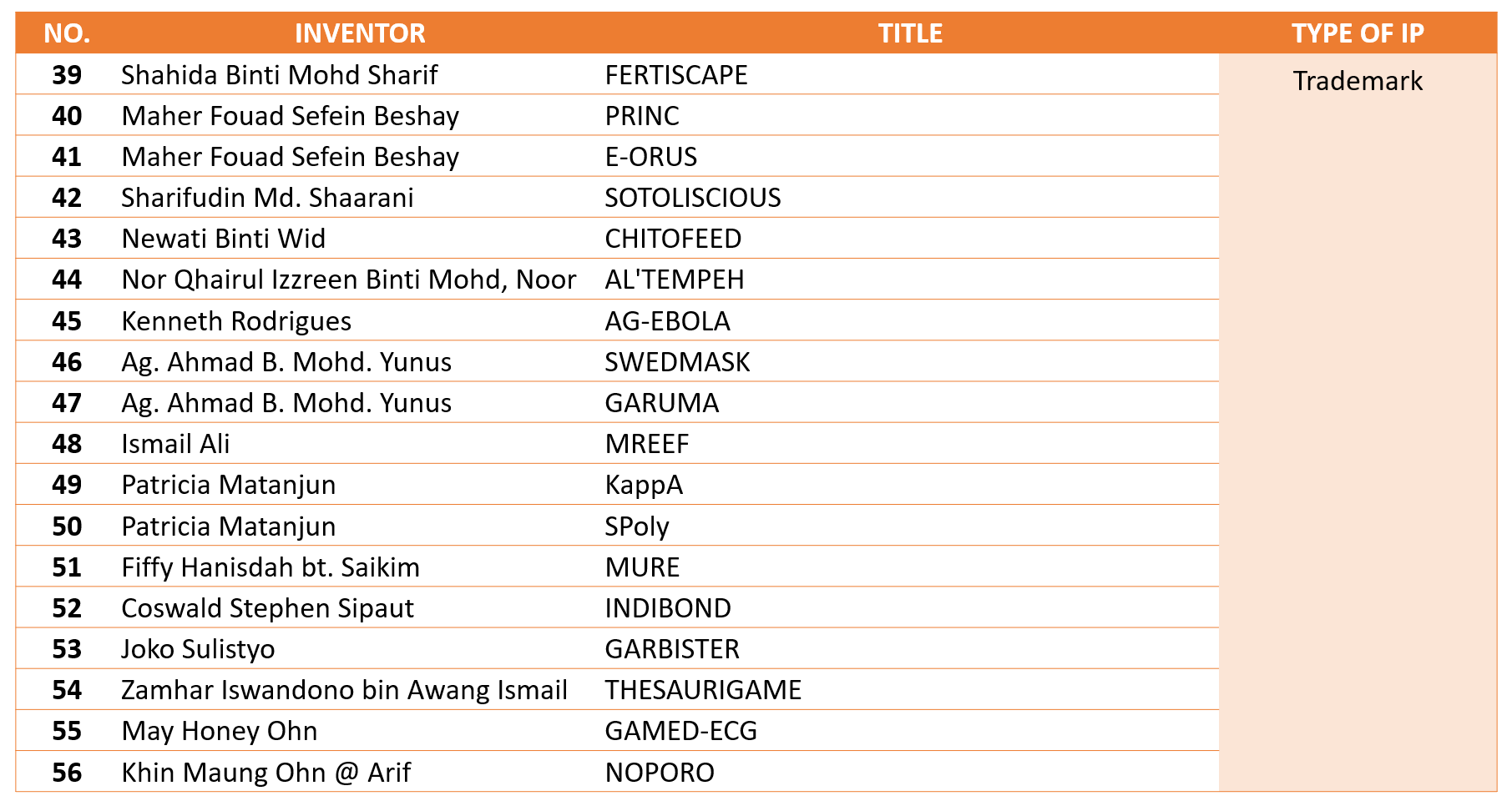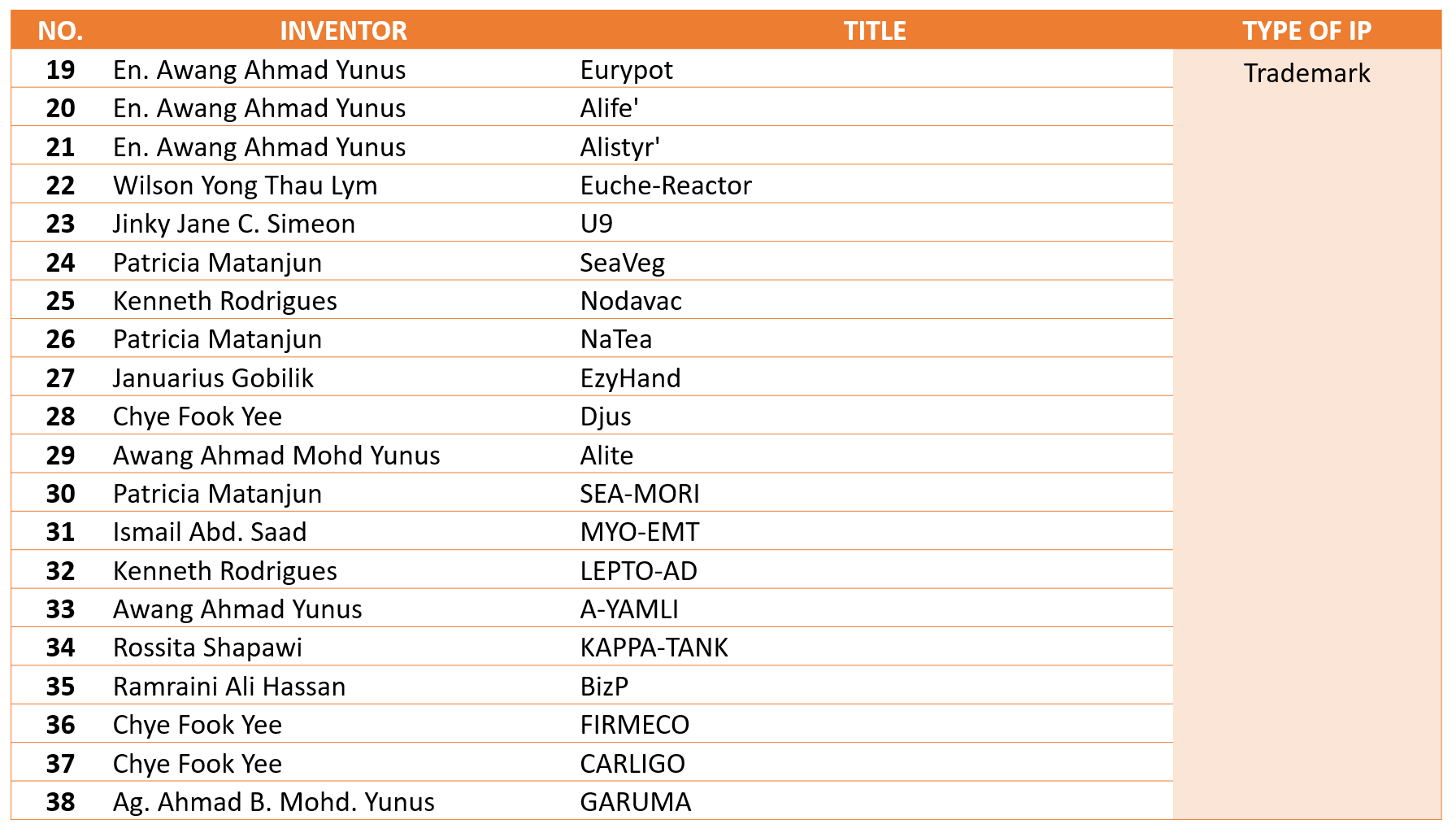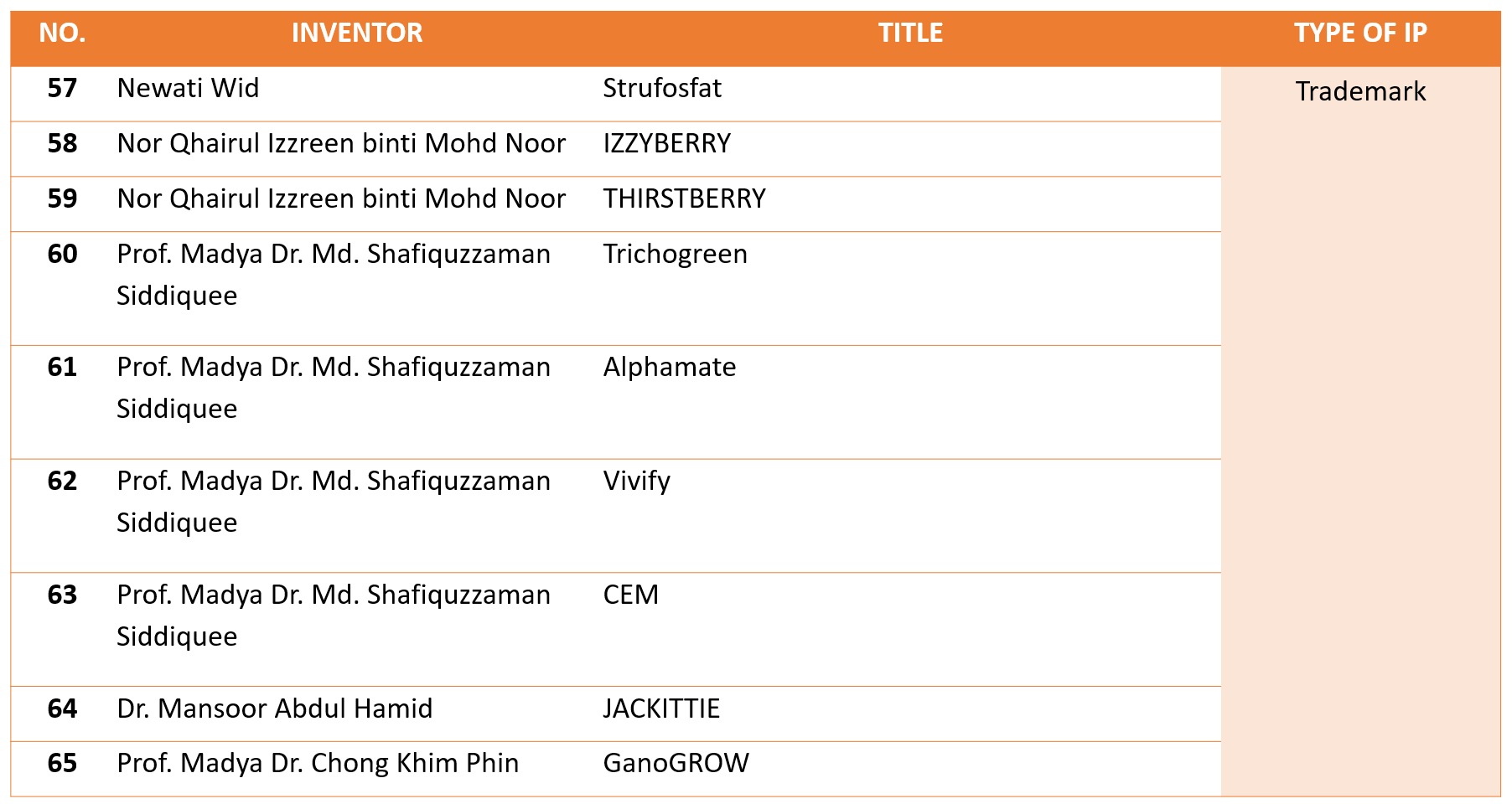 01 December 2020 Hits: 2835 TRADEMARKS Print Email DETAIL OF INTELLECTUAL PROPERTIESTRADEMARKS65 PRODUCTS OF TRADEMARKS