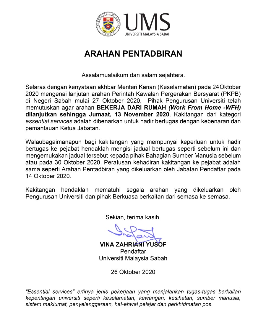 Subjek: Makluman Lanjutan Arahan Pentadbiran Berkaitan Perintah Kawalan Pergerakan Bersyarat (PKPB) di Seluruh Negeri Sabah