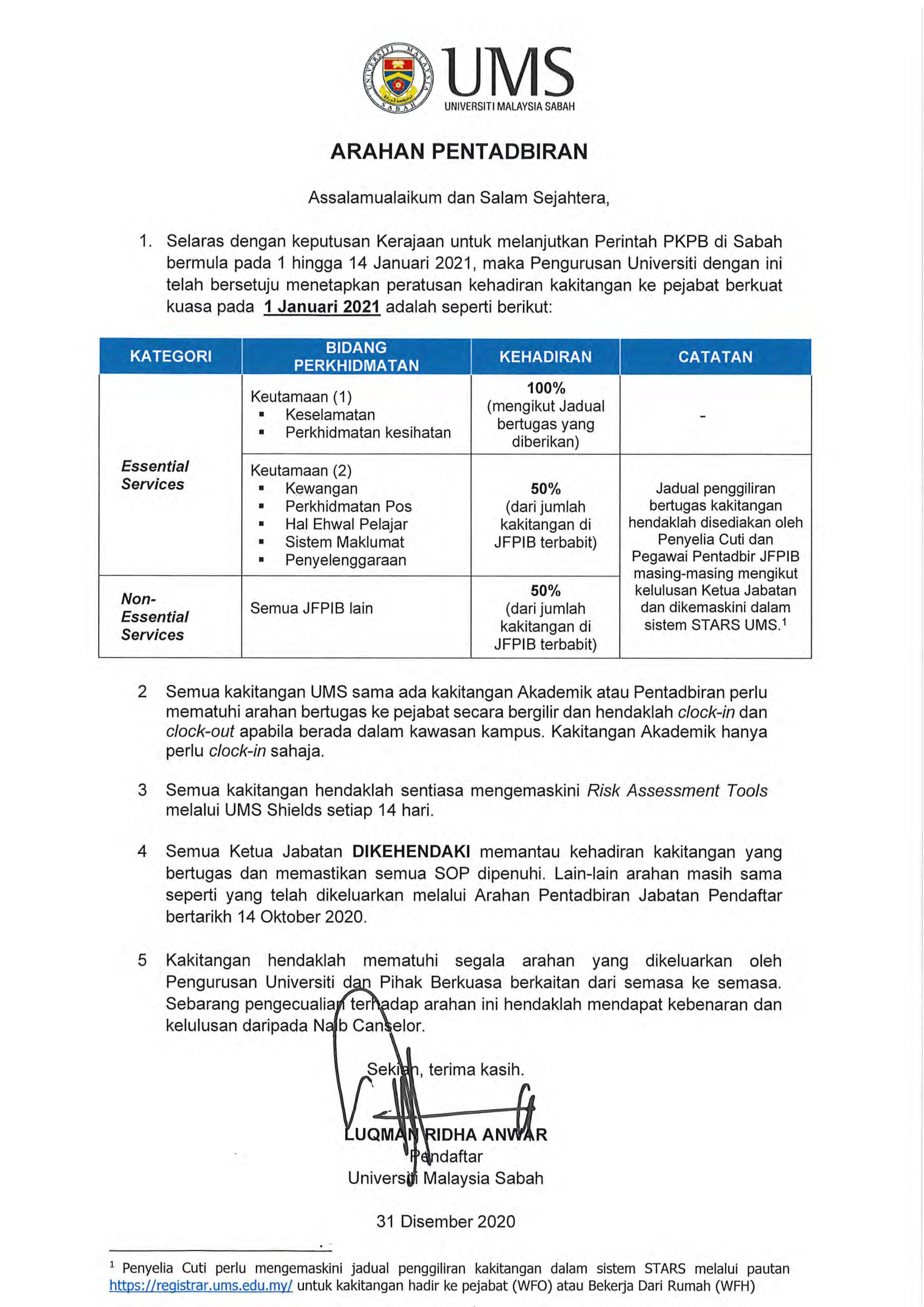 31 Disember 2020 Jumlah paparan: 3697 Arahan Pentadbiran: Peratusan Kehadiran Kakitangan Ke Pejabat Cetak Emel Pengumuman Daripada: Jabatan Pendaftar, UMS