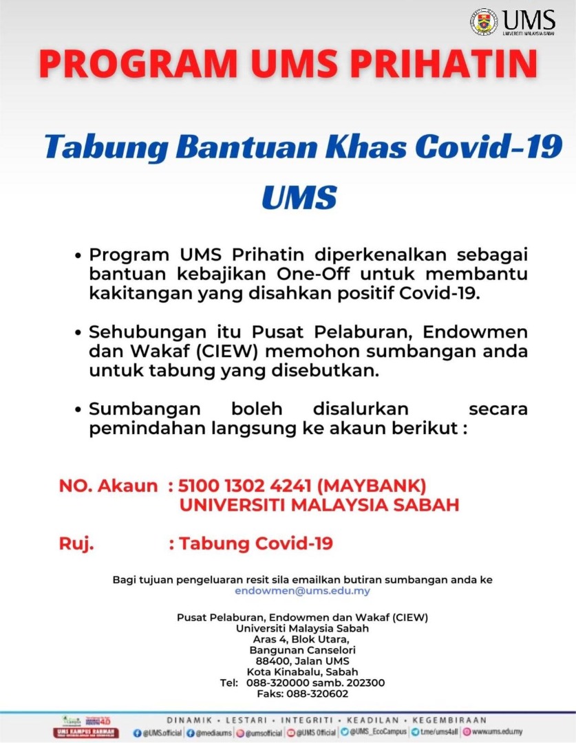 Sumbangan anda boleh disalurkan ke Tabung Bantuan Khas Covid-19 UMS melalui nombor akaun yang tertera dalam poster berikut.