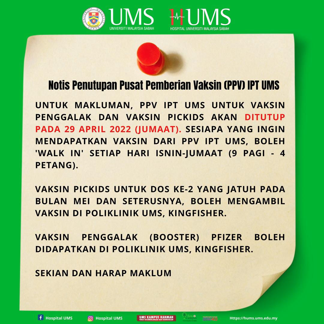 20 April 2022 Jumlah paparan: 1942 Notis Penutupan Pusat Pemberian Vaksin (PPV) IPT UMS Cetak Emel Pengumuman Daripada: Hospital UMS