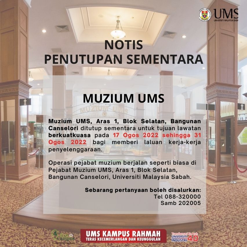 Penutupan Sementara Muzium UMS berkuat kuasa 17 sehingga 31 Ogos 2022.