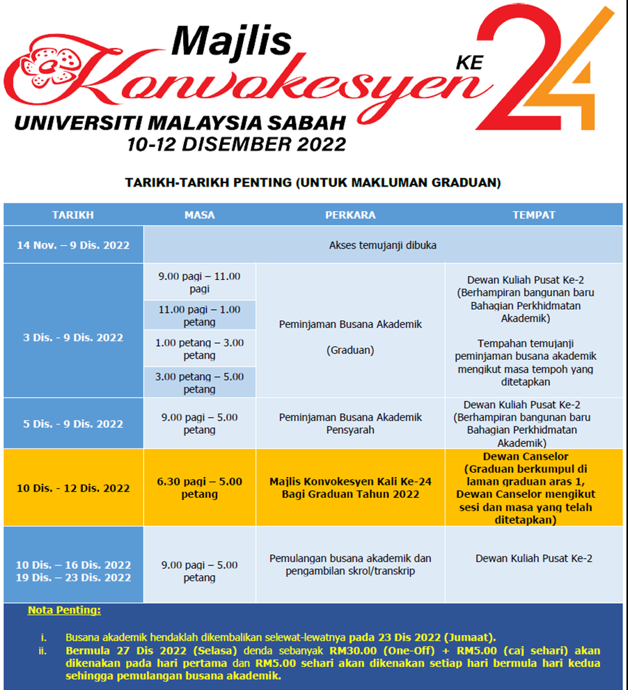 22 November 2022 Jumlah paparan: 3044 Tarikh-tarikh Penting Majlis Konvokesyen UMS Ke-24 (Untuk Makluman Graduan) Cetak Emel Pengumuman Daripada: Bahagian Perkhidmatan Akademik