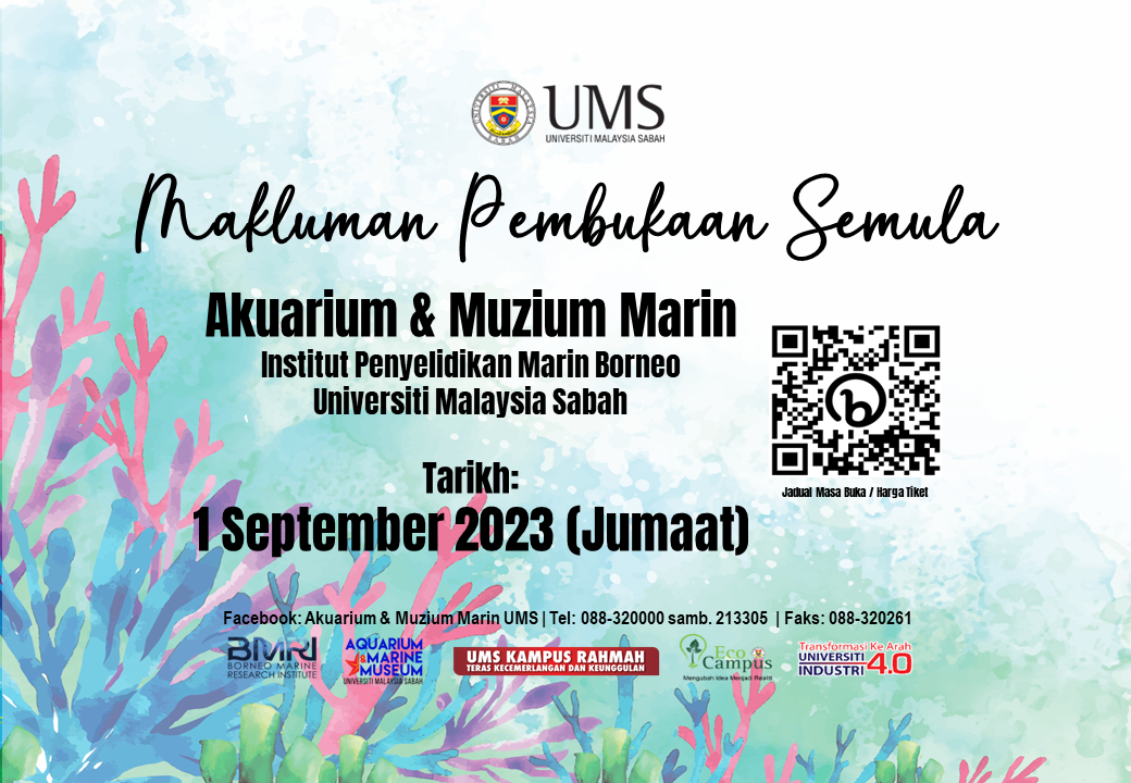 04 September 2023 Jumlah paparan: 952 Makluman Pembukaan Semula Akuarium dan Muzium Marin, Institut Penyelidikan Marin Borneo UMS Cetak Emel Pengumuman Daripada: Institut Penyelidikan Marin Borneo