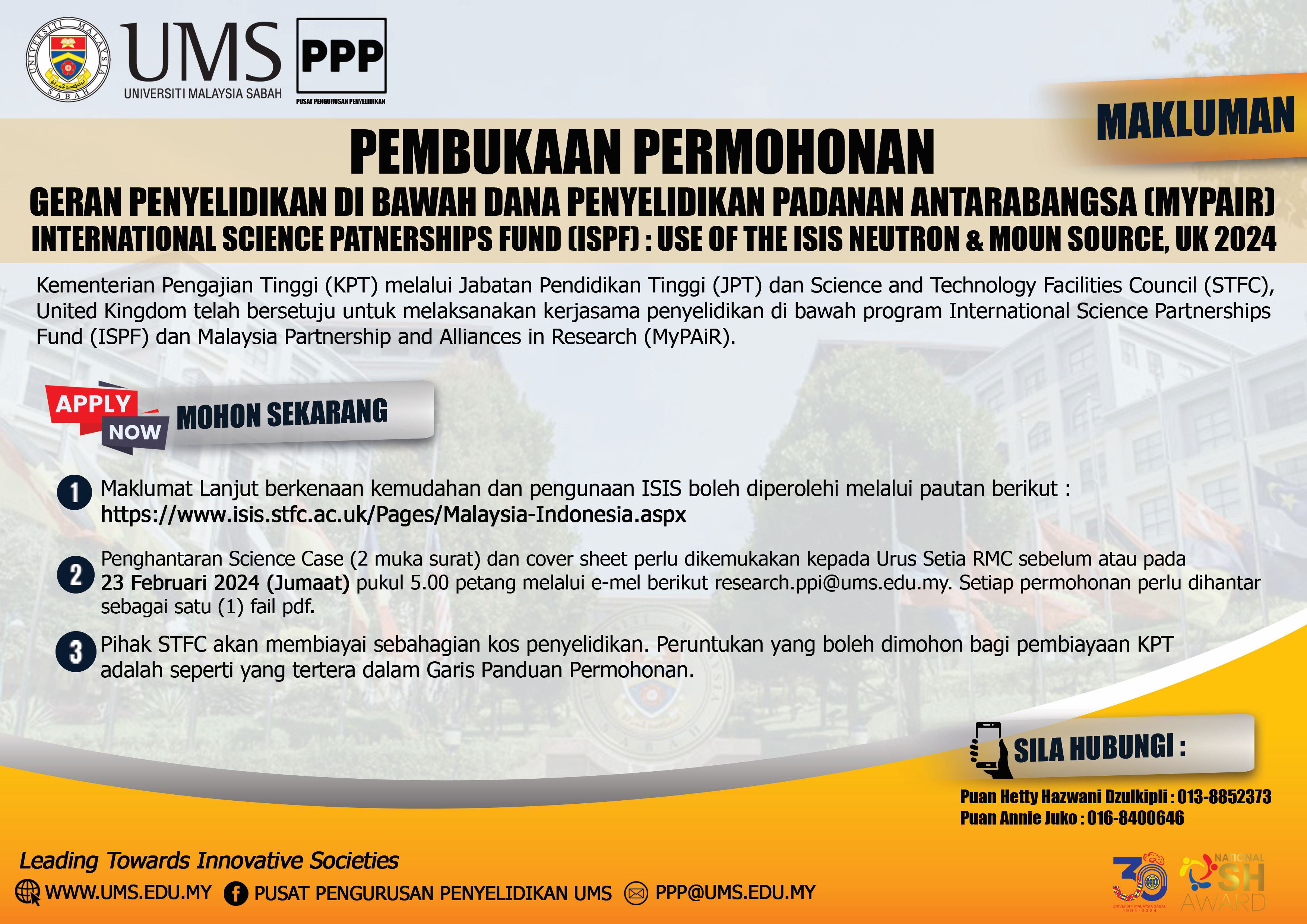 Makluman Pembukaan Permohonan Bagi Geran Penyelidikan di Bawah Dana Penyelidian Padanan Antarabangsa - International Science Partnership Fund: Use of The ISIS Neutron & Muon Source, UK 2024