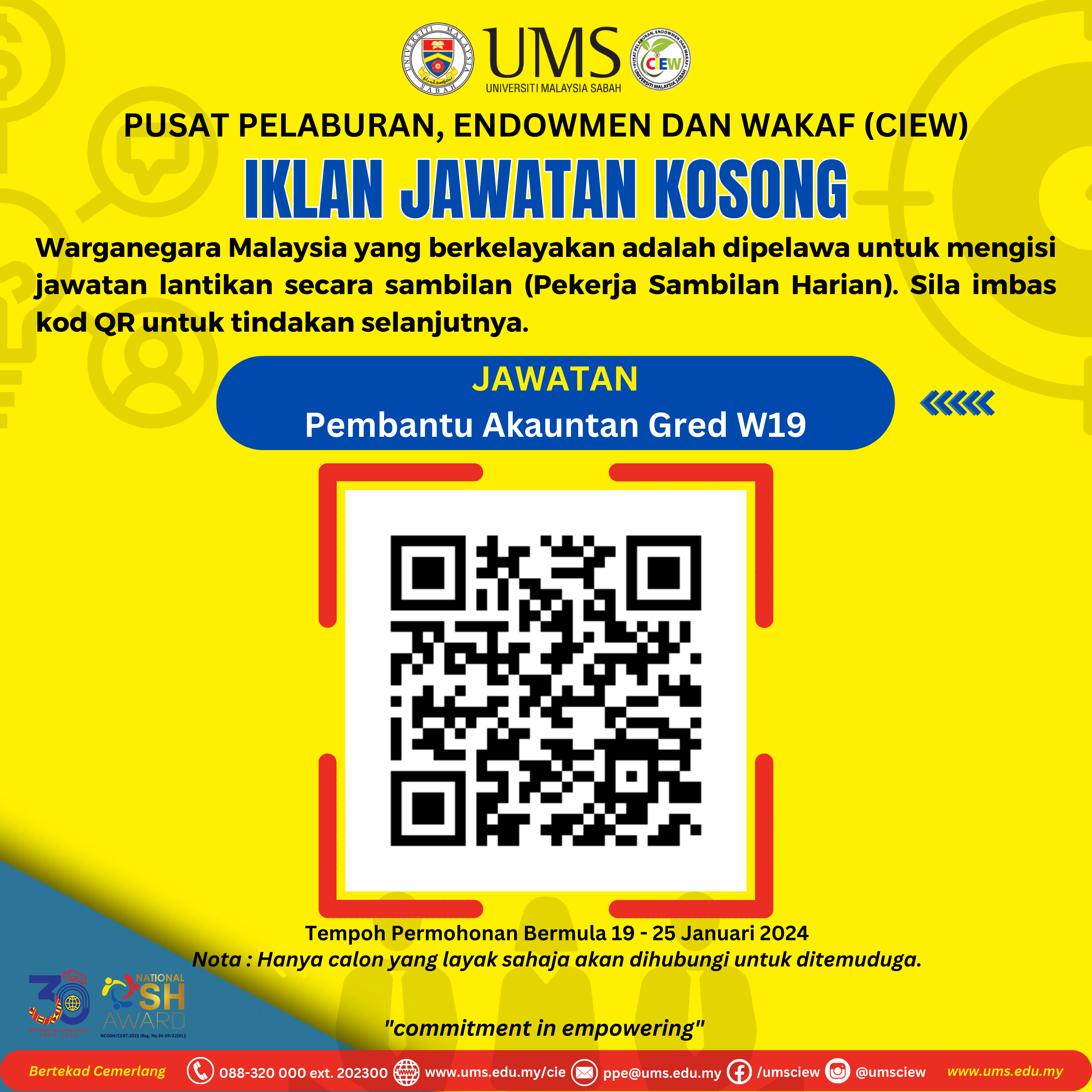 Warganegara Malaysia yang berkelayakan adalah dipelawa untuk mengisi jawatan lantikan secara sambilan (Pekerja Sambilan Harian). Sila imbas kod QR untuk tindakan selanjutnya.